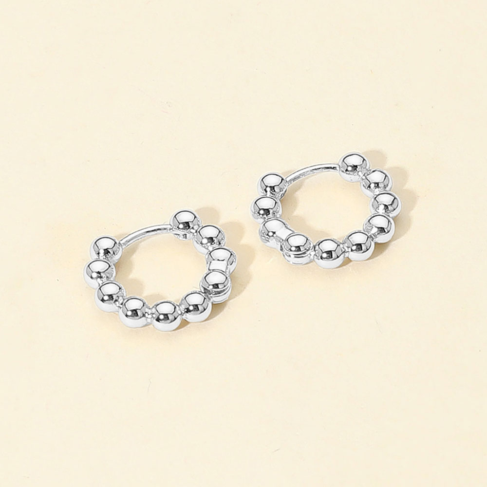 Details • Size : 0.6" X 0.6" • Huggie Back • Elegant beaded hoop earrings designed with polished round beads in a timeless circular style. Lightweight and versatile, these hoops enhance any outfit with subtle shine and modern elegance, making them perfect for daily wear or dressing up for special occasions. • Brass • Gold Dipped • Hypoallergenic • Lead and Nickel Compliant • Made In Korea