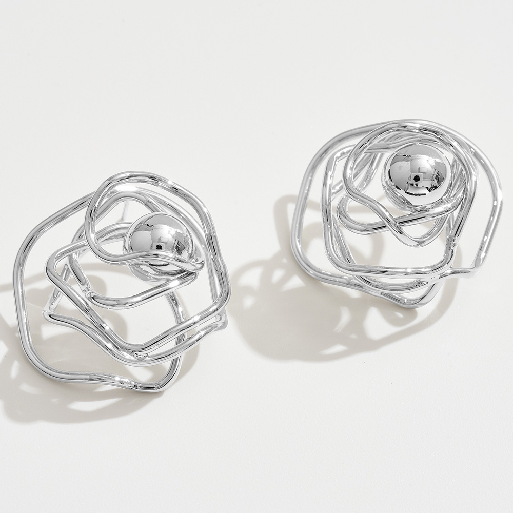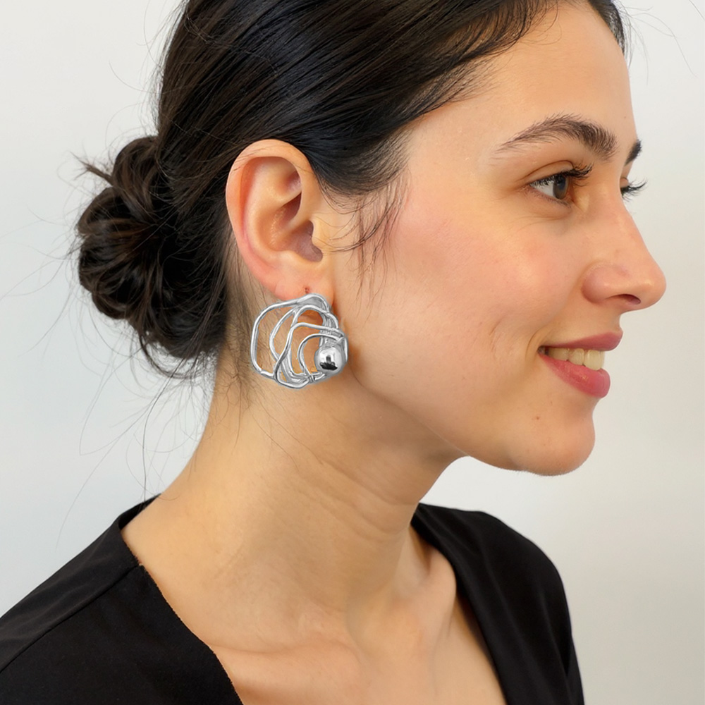 Details • Size : 1.3" X 1.3" • Post Back • Unique abstract wire stud earrings designed with freeform loops surrounding a polished orb centerpiece. These artistic earrings bring a sculptural, modern edge to any look, blending bold creativity with lightweight wear for everyday style or special occasions. • Lead and Nickel Compliant • Hypoallergenic • Made In Korea • Gold Dipped • Brass