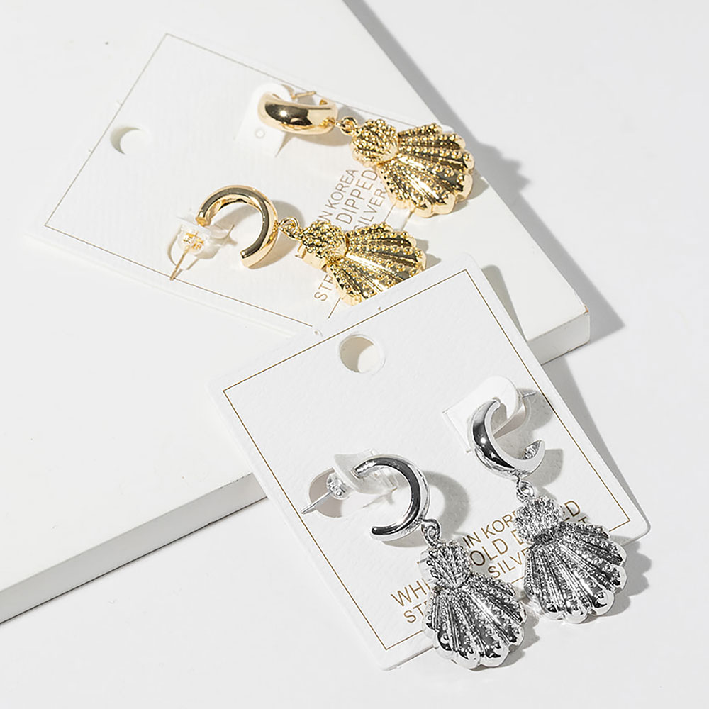 Details • Size : 0.75" X 1.75" • Scallop shell drop earrings featuring a sculpted shell motif with dimensional texture and elegant movement. Designed to complement resort looks, coastal edits, and everyday styling, these statement drops offer timeless seaside charm for boutique assortments and gift-ready displays. • Gold Dipped • Lead and Nickel Compliant • Made In Korea • Sterling Silver Post