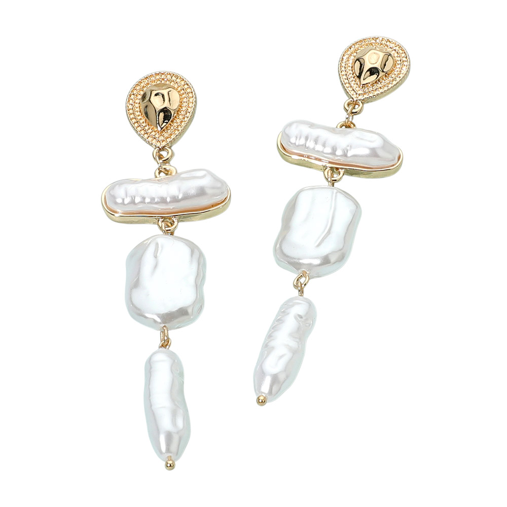 Details • Size : 1" X 3.5" • Post Back • Eye-catching drop earrings designed with layered organic pearl shapes for a modern statement look. The fluid silhouette creates graceful movement and adds instant elegance to both casual and dressy outfits. A versatile accessory ideal for boutiques seeking on-trend styles that feel refined, feminine, and easy to style for everyday wear or special occasions. • Lead and Nickel Compliant