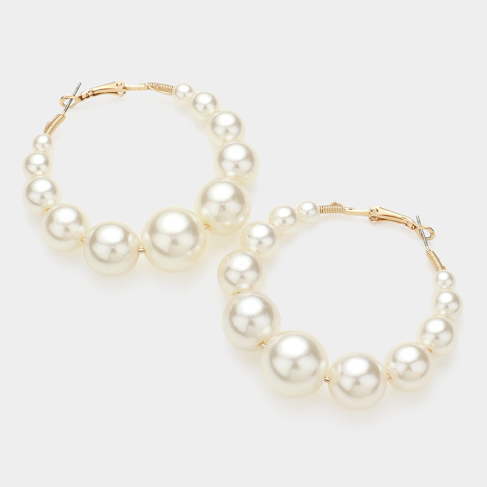 Details • Size : 2.25" X 2.25" • Omega Closure • Elevate your accessories with these bold faux pearl beaded hoop earrings featuring a playful arrangement of glossy round beads. The vibrant and dynamic design adds a fun and lively touch to your outfit, making them perfect for festivals, casual wear, or standout fashion statements. • Lead and Nickel Compliant
