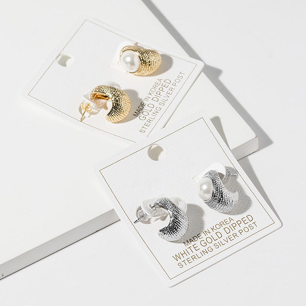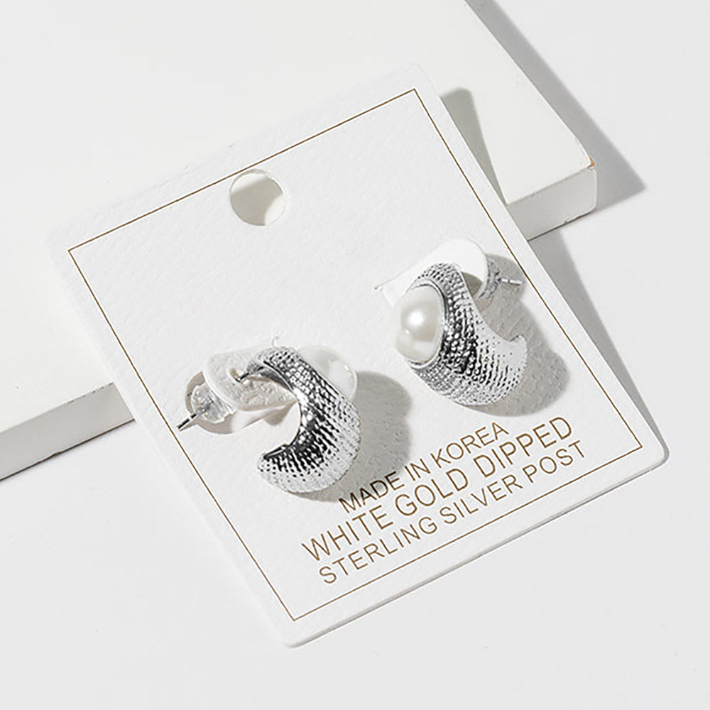Details • Size : 0.5" X 0.75" • Textured crescent stud earrings featuring a sculpted curved shape with a smooth round pearl accent for a refined, modern look. Designed to elevate everyday styling, these studs pair effortlessly with casual outfits, office wear, or layered ear looks, offering timeless appeal with subtle statement detail. • Gold Dipped • Lead and Nickel Compliant • Made In Korea • Sterling Silver Post