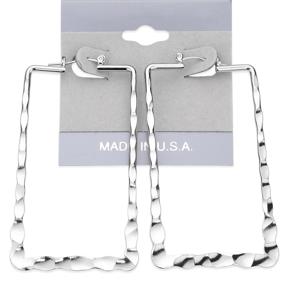 Details • Size : 1.4" X 2.6" • Pin Catch • Made In USA • Stand out with these hammered square hoop earrings featuring a bold geometric shape and textured finish. Their unique design blends modern sophistication with everyday wearability, making them an eye-catching accessory that enhances both casual and dressy looks.
