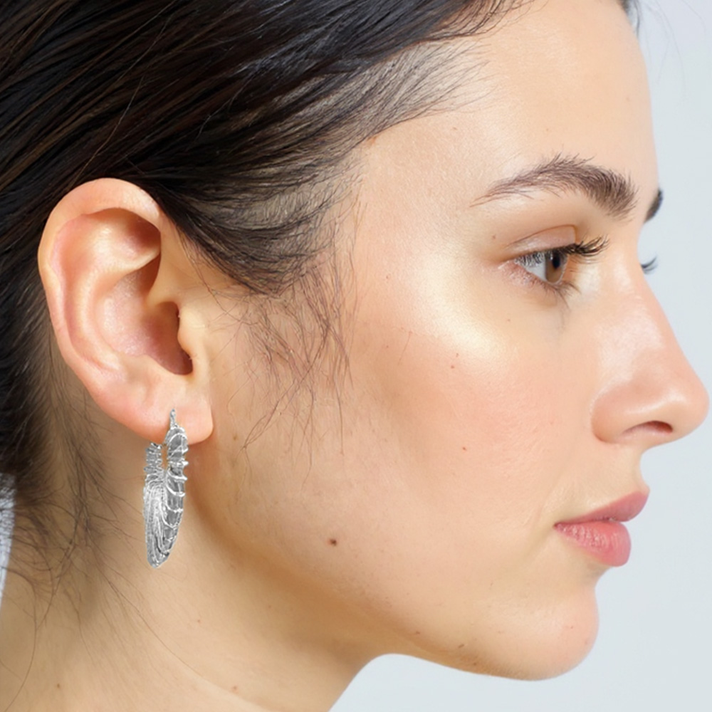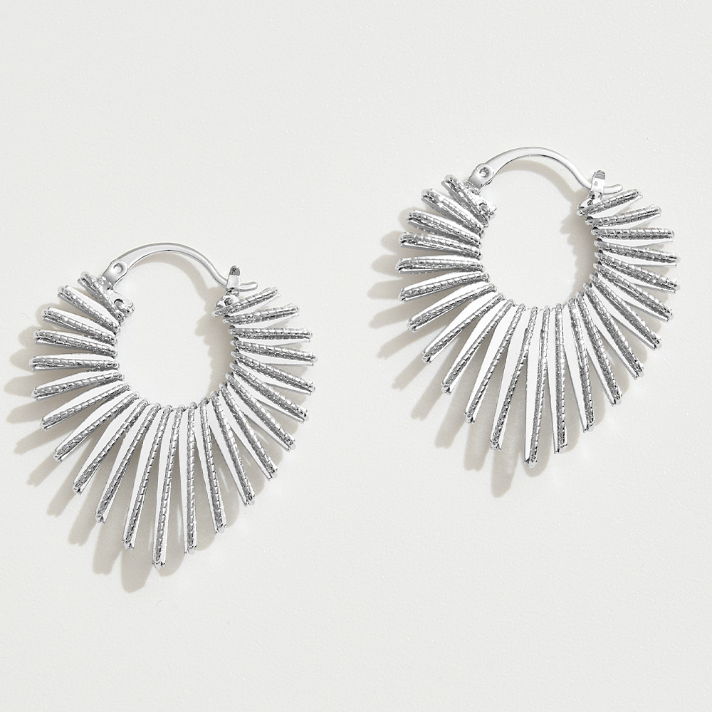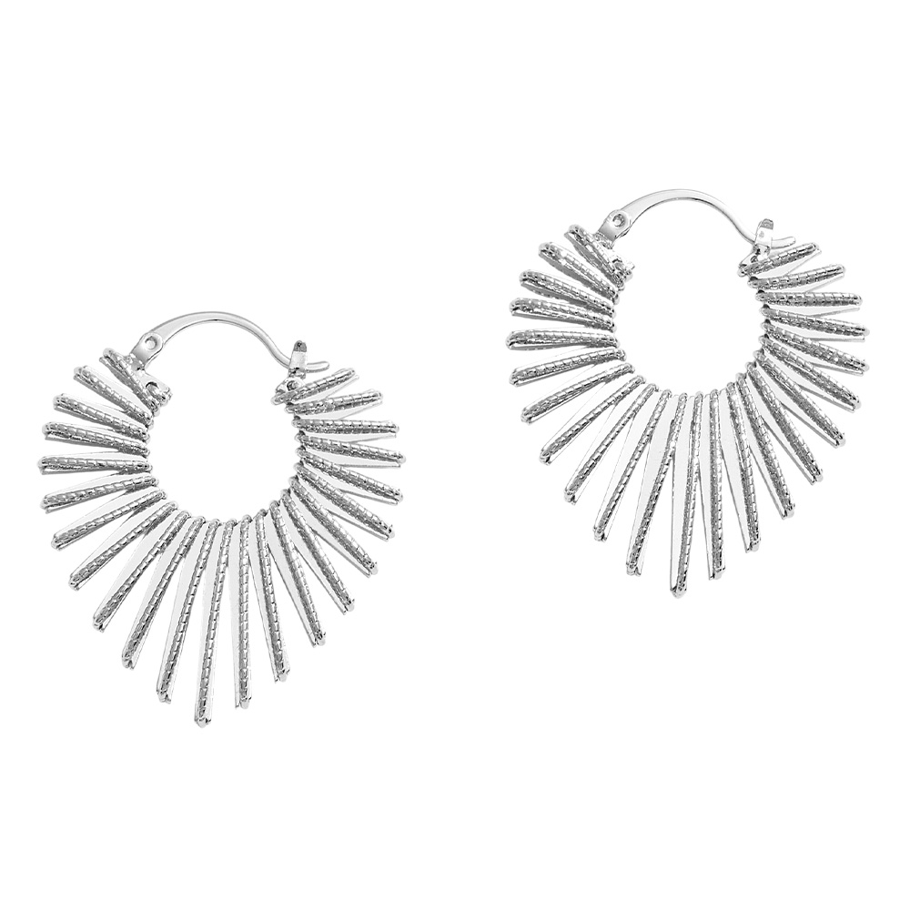 Details • Size : 1.25" X 1.3" • Pin Catch • Shine bright with these radiating sunburst hoop earrings, designed with textured spikes that fan outward in a striking silhouette. Bold yet lightweight, they bring a touch of modern edge and effortless glamour, perfect for upgrading casual looks or making a statement at night. • Brass • Gold Dipped • Hypoallergenic • Lead and Nickel Compliant • Made In Korea