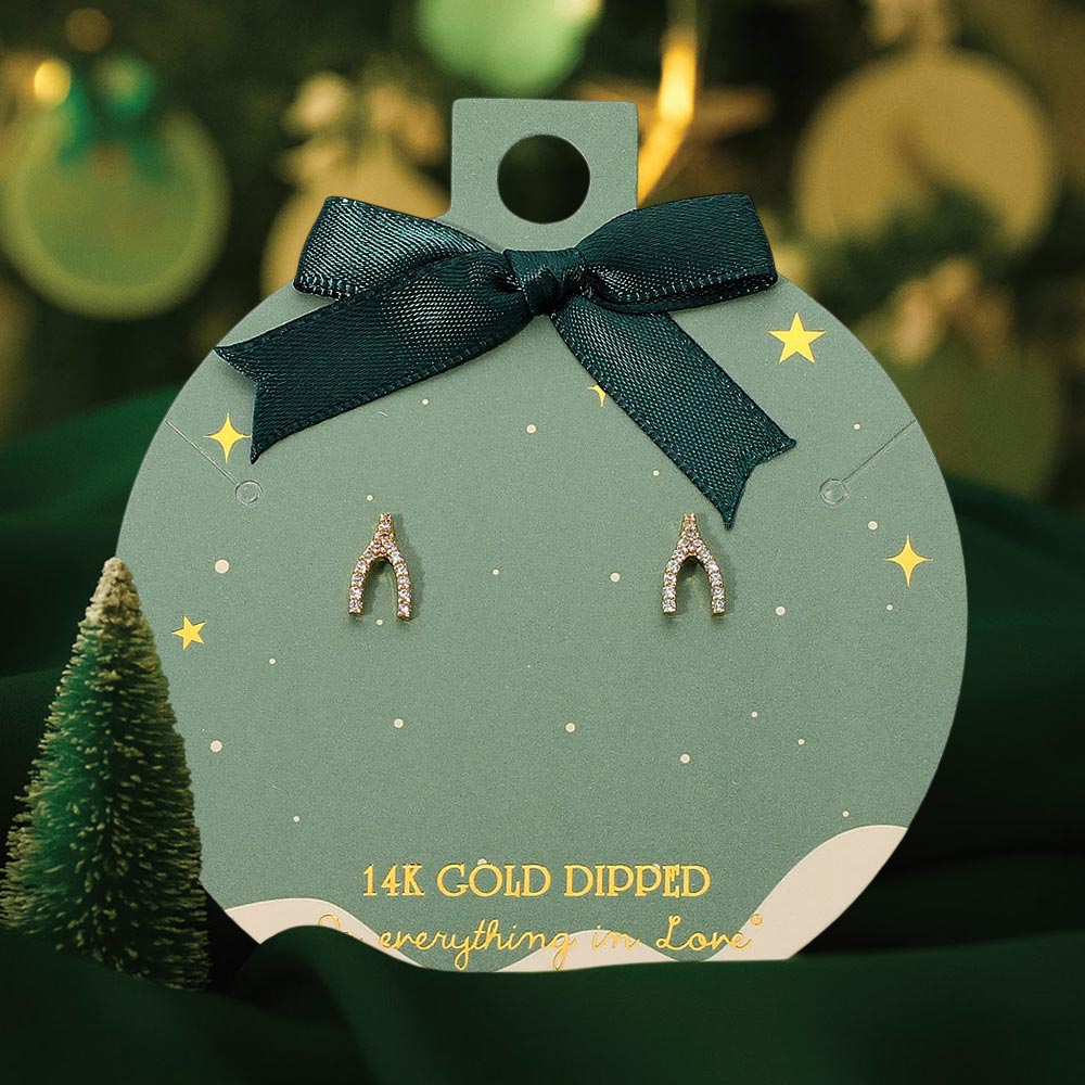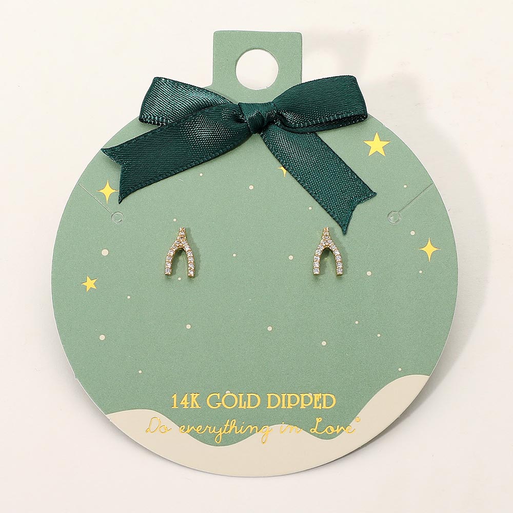 Details • Size : 0.25" X 0.4" • Post Back • Elegant wishbone stud earrings featuring a slim, sparkling design with stone accents. A refined 14K gold dipped accessory perfect for everyday wear or gifting, adding a subtle touch of charm and sophistication to any look. • Gold Dipped • Hypoallergenic • Lead and Nickel Compliant • Made In Korea