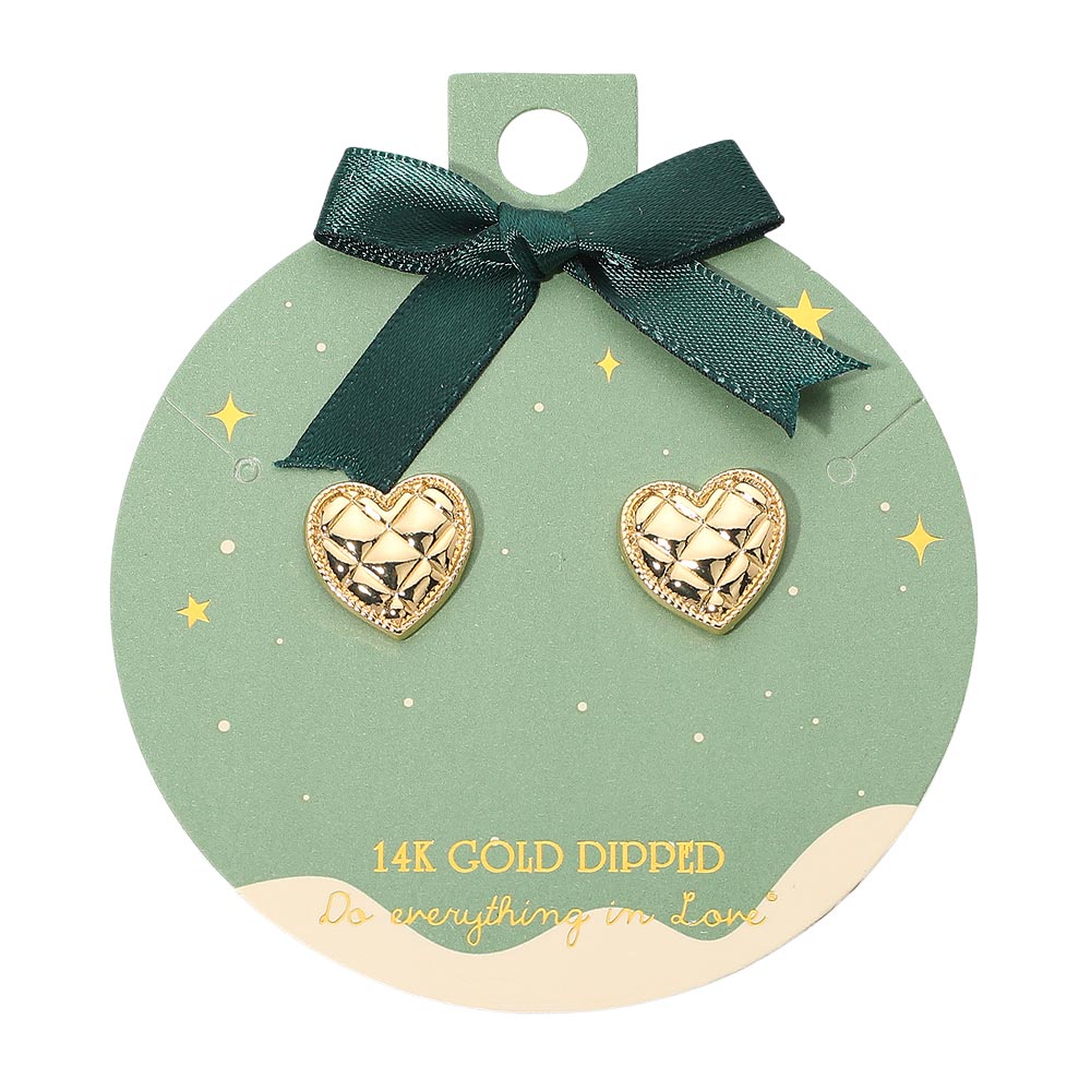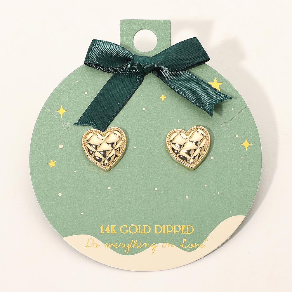 Details • Size : 0.6" X 0.6" • Post Back • Chic textured heart stud earrings featuring a sculpted, dimensional surface that adds subtle shine and texture. Their refined shape makes them perfect for everyday wear, seasonal styling, or gifting. A versatile accessory that brings a polished, elegant touch to any outfit with its modern heart design. • Gold Dipped • Hypoallergenic • Lead and Nickel Compliant • Made In Korea