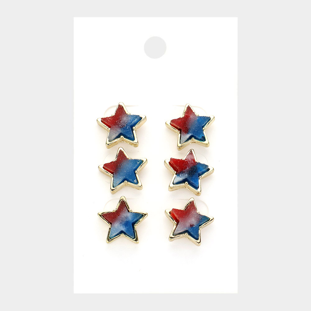 3PAIRS - American USA Flag Theme Druzy Star Stud Earrings Set