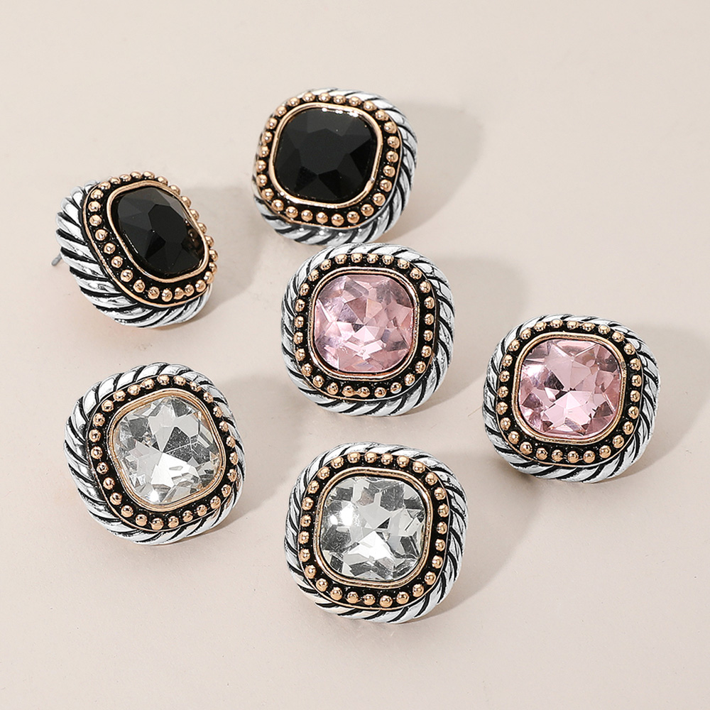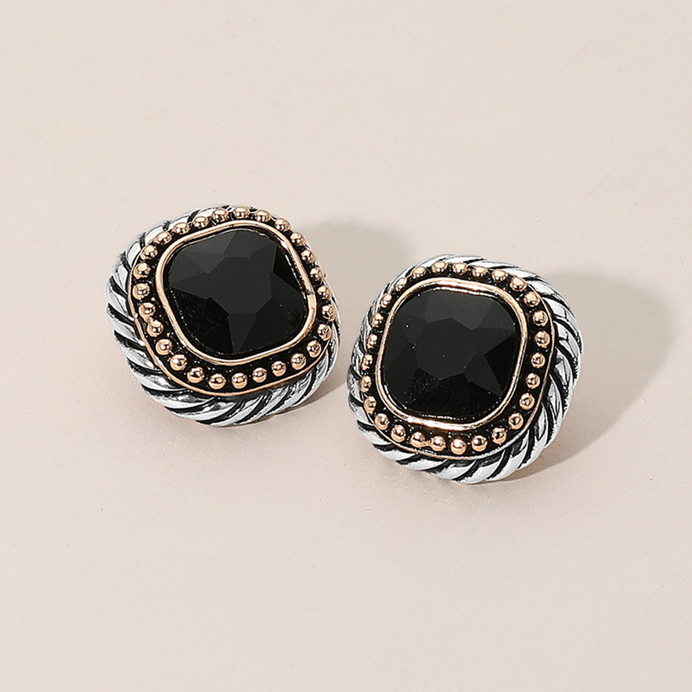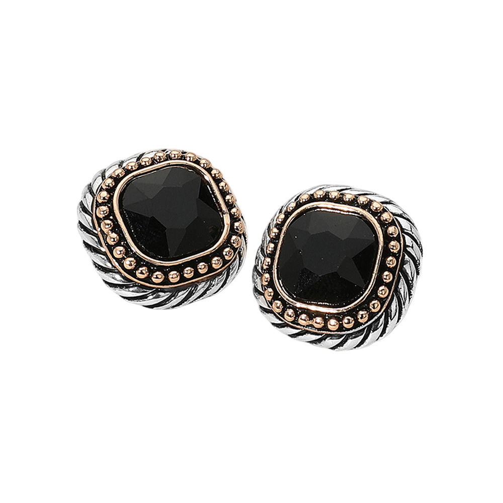 Bold Square Stone Centered Two Tone Metal Sud Earrings
