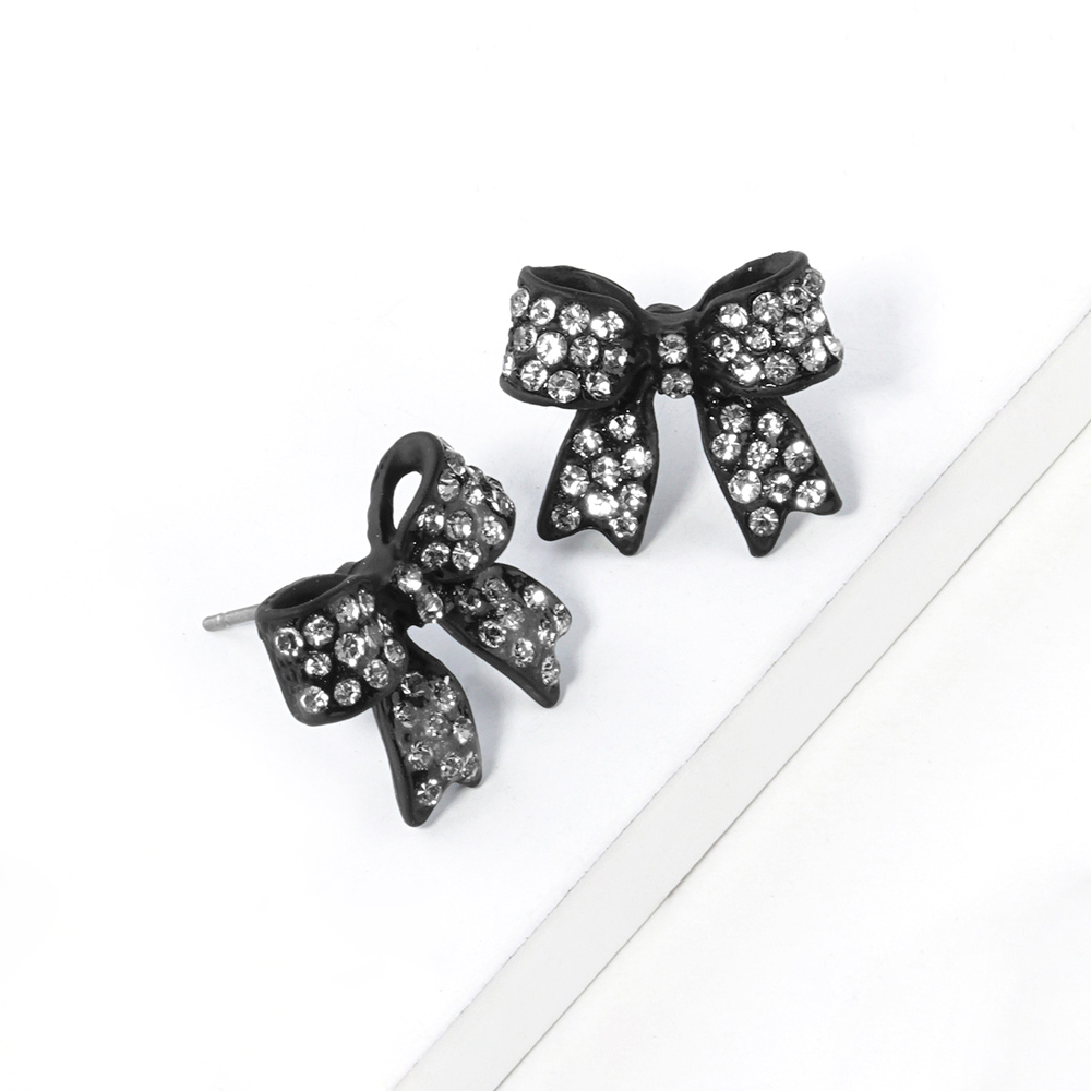 Details • Size : 0.75" X 0.6" • Post Back • Dazzling rhinestone bow earrings designed to add a feminine sparkle to any outfit. These chic stud earrings combine classic charm with modern glam, perfect for weddings, parties, or everyday elegance. Lightweight and radiant, they elevate your look with timeless sophistication. • Lead and Nickel Compliant