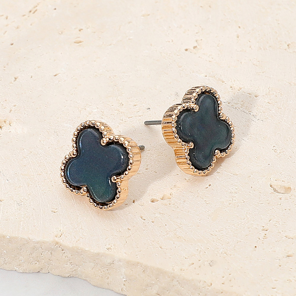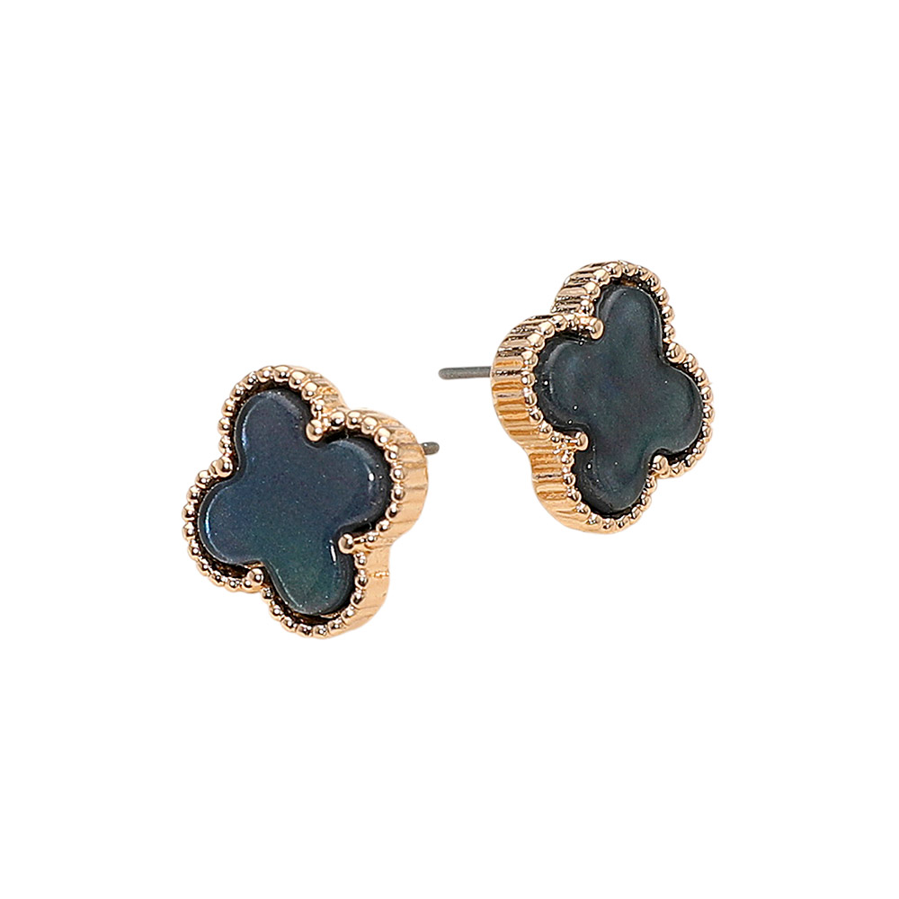 Details • Size : 0.6" X 0.6" • Post Back • Stylish stud earrings featuring a quatrefoil shape framed with textured trim for a chic, timeless look. Perfect for elevating everyday outfits or pairing with elegant attire, these earrings offer a touch of sophistication and modern simplicity in one graceful design. • Lead and Nickel Compliant