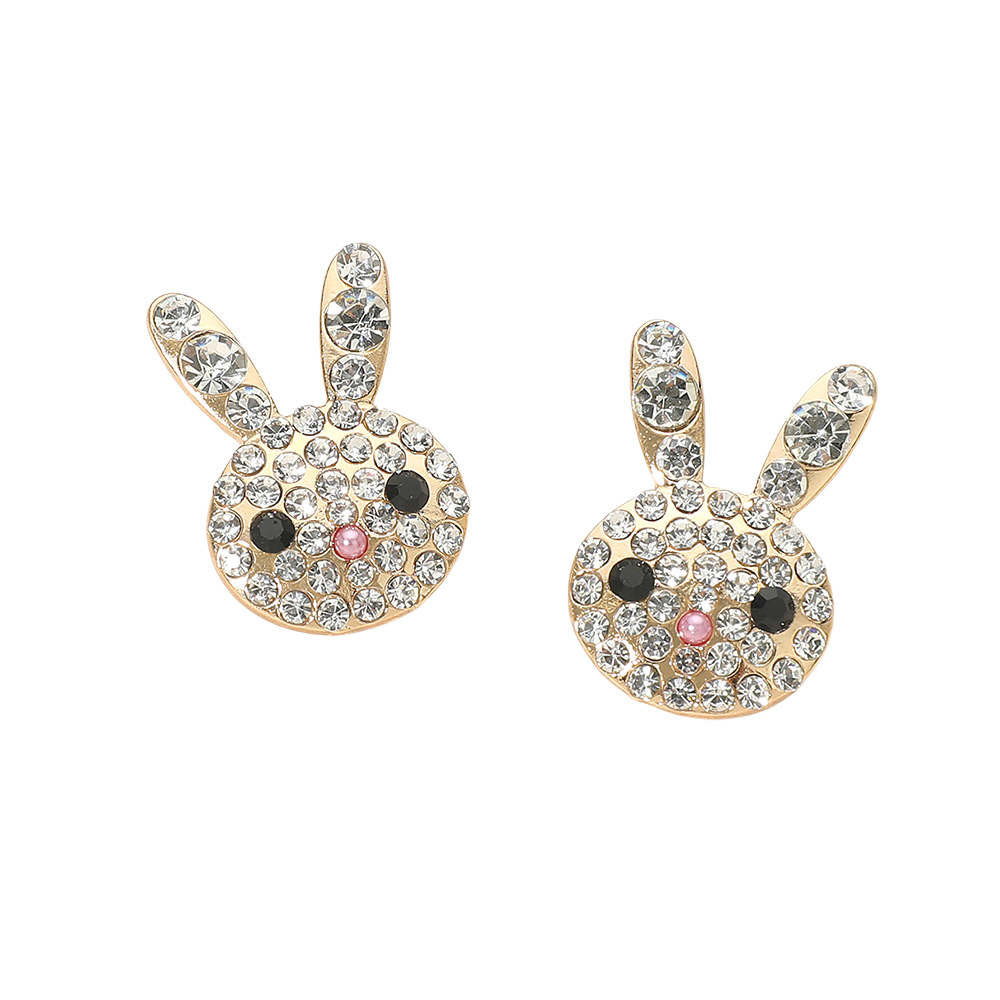 Details • Size : 0.7" X 1" • Post Back • Charming bunny stud earrings featuring a playful animal face silhouette with sparkling accents that catch the light beautifully. Designed to add a cute yet eye-catching touch to everyday looks, themed outfits, gift assortments, and novelty jewelry collections. • Hypoallergenic • Lead and Nickel Compliant