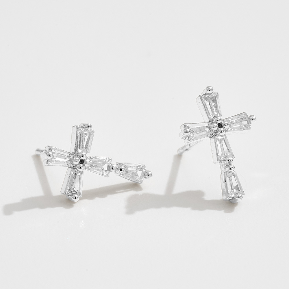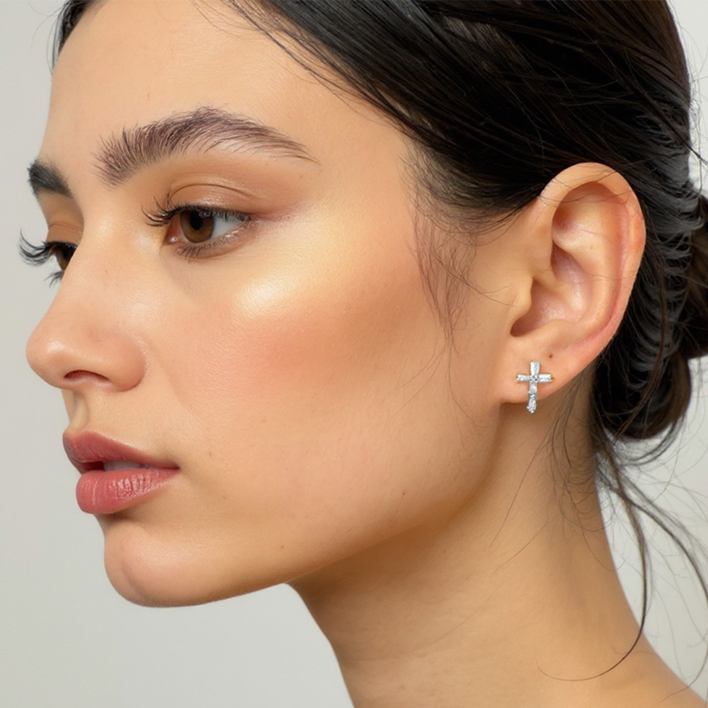 • These baguette cut cross stud earrings feature sparkling rhinestone accents for a refined, radiant look. Perfect for everyday elegance or special occasions, they combine timeless symbolism with a modern touch, making them a versatile addition to any jewelry collection.