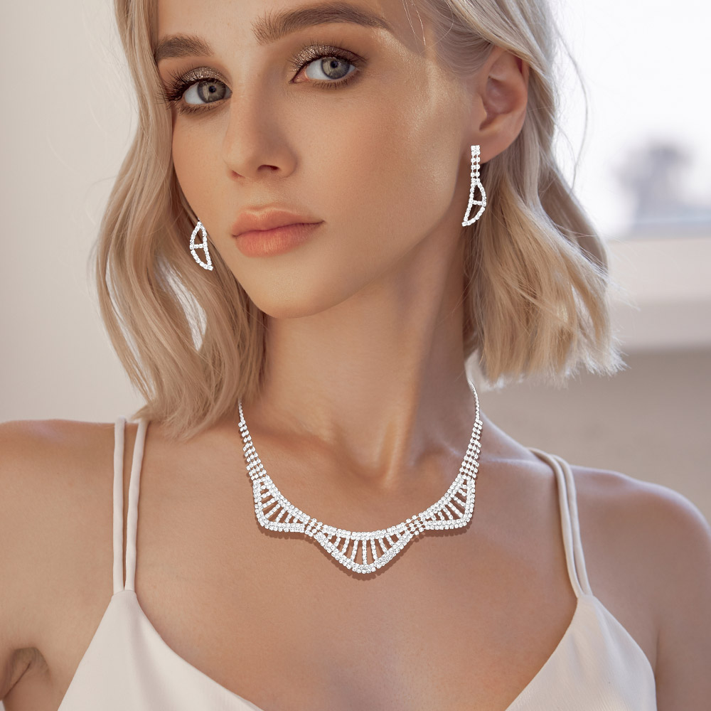 • Elevate your style with this crystal fan necklace and matching earrings set. Featuring a modern geometric design with sparkling stones, this elegant jewelry set is perfect for weddings, parties, and glamorous evening events.