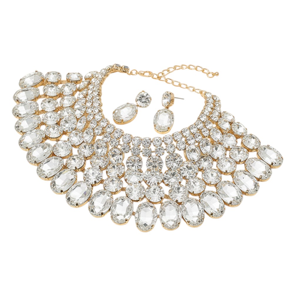 • Dramatic bib necklace and earring set featuring layered oval stones arranged in a bold cascading design. Perfect for weddings, galas, performances or any occasion that calls for standout glamour. An eye-catching accessory set that elevates formal and evening looks.