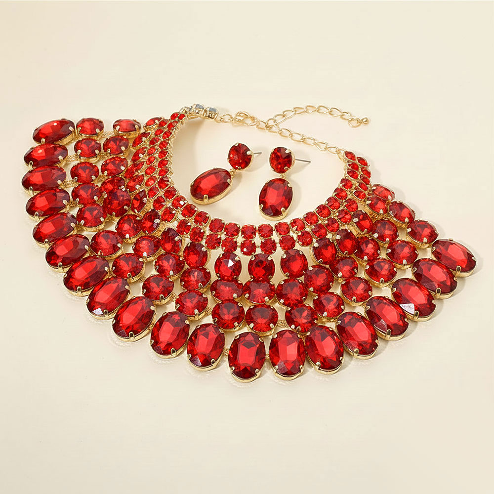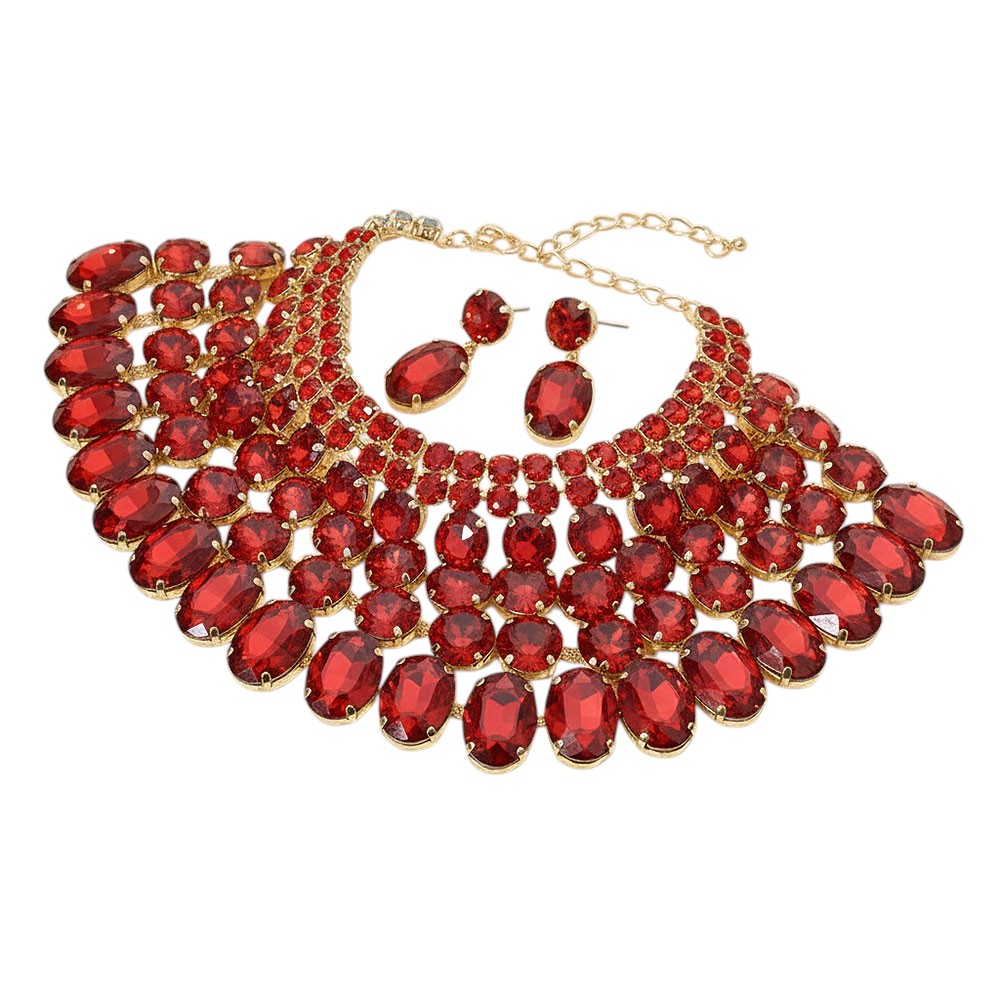 Details • Necklace Size: 13" + 4" L • Decor Size: 3.7" L • Earring Size: 1.75" L • Dramatic bib necklace and earring set featuring layered oval stones arranged in a bold cascading design. Perfect for weddings, galas, performances or any occasion that calls for standout glamour. An eye-catching accessory set that elevates formal and evening looks.