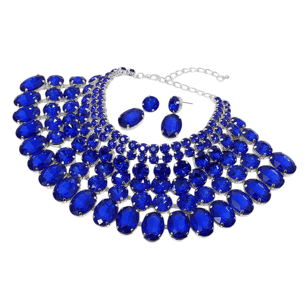 • Dramatic bib necklace and earring set featuring layered oval stones arranged in a bold cascading design. Perfect for weddings, galas, performances or any occasion that calls for standout glamour. An eye-catching accessory set that elevates formal and evening looks.