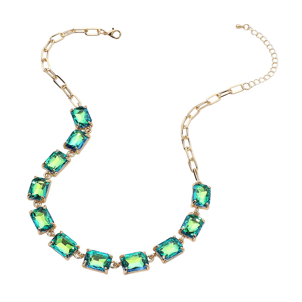 • This elegant gemstone chain necklace features a row of precisely cut stones linked with a sleek chain for a refined, modern look. Its adjustable closure ensures a comfortable fit, making it a sophisticated accessory for formal occasions, evening wear, or adding a statement touch to everyday style.