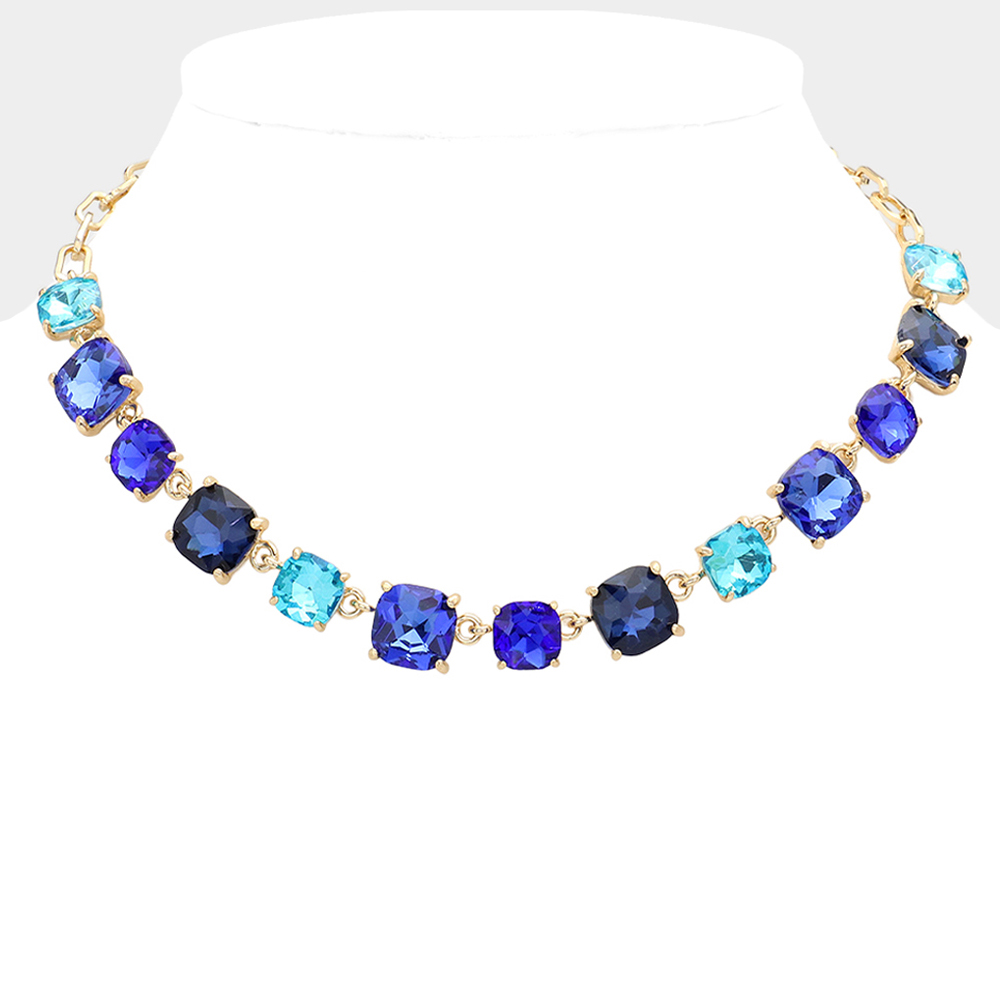Details • Necklace Size : 16" + 2.75" L • Decor Size : 0.5" L • Elevate your style with this stunning square cut gemstone statement necklace. Featuring shimmering faceted stones linked in a classic design, it offers a chic adjustable fit. Perfect for evening wear, weddings, parties, or adding a sophisticated sparkle to your everyday look. • Lead and Nickel Compliant