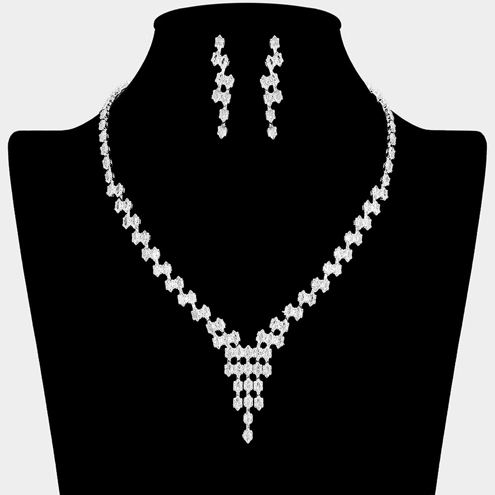 Details • Necklace Size : 16" + 3" L • Decor Size : 1.5" L • Earring Size : 1.5" L • Exuding elegance and timeless beauty, this crystal V-shaped necklace with matching earrings creates a striking silhouette. Designed to add brilliance and sophistication, it’s the perfect accessory for formal occasions, evening events, or enhancing your bridal and gala looks. • CZ Cubic Zirconia • Lead and Nickel Compliant