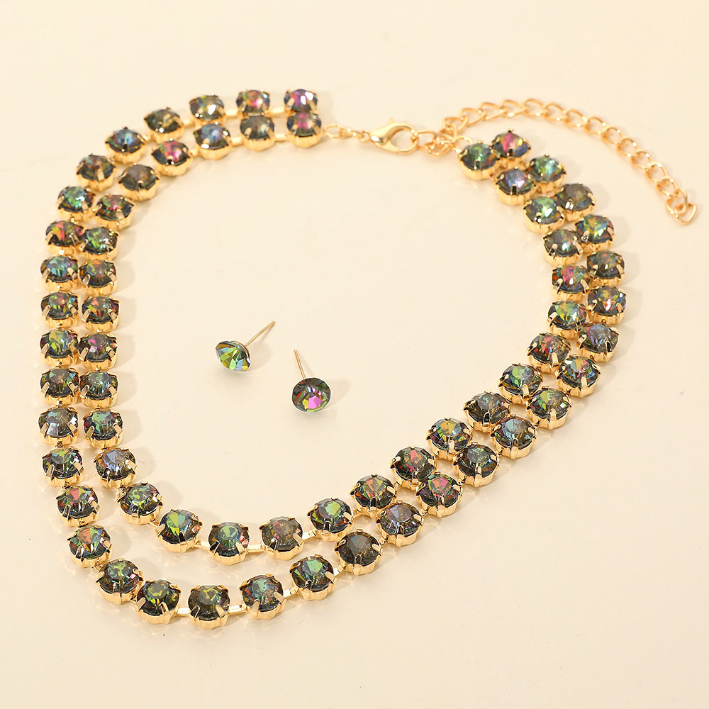 Details • Necklace Size : 13.5" + 3"L • Decor Size : 1" L • Earrings Size : 0.3" L • This double row rhinestone necklace and matching stud earring set adds radiant sparkle to any outfit. Designed to enhance both casual and formal looks, it delivers timeless elegance and refined glamour—perfect for evening events, special occasions, or adding shine to everyday wear. • Lead and Nickel Compliant