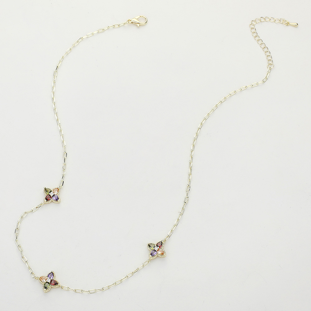 14K Gold Plated Colorful CZ Stone Clover Pendant Station Paperclip Chain Necklace