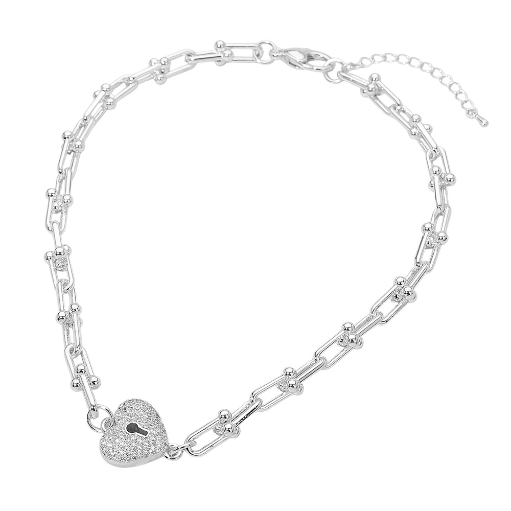 Details • Necklace Size : 16.5" + 2" L • Decor Size : 0.8" L • This stylish chain necklace features a heart lock charm with sparkling CZ accents, creating a bold yet elegant statement. Designed for everyday wear or special occasions, it adds a modern romantic touch and pairs easily with both casual and elevated looks. • CZ Cubic Zirconia • Gold Dipped