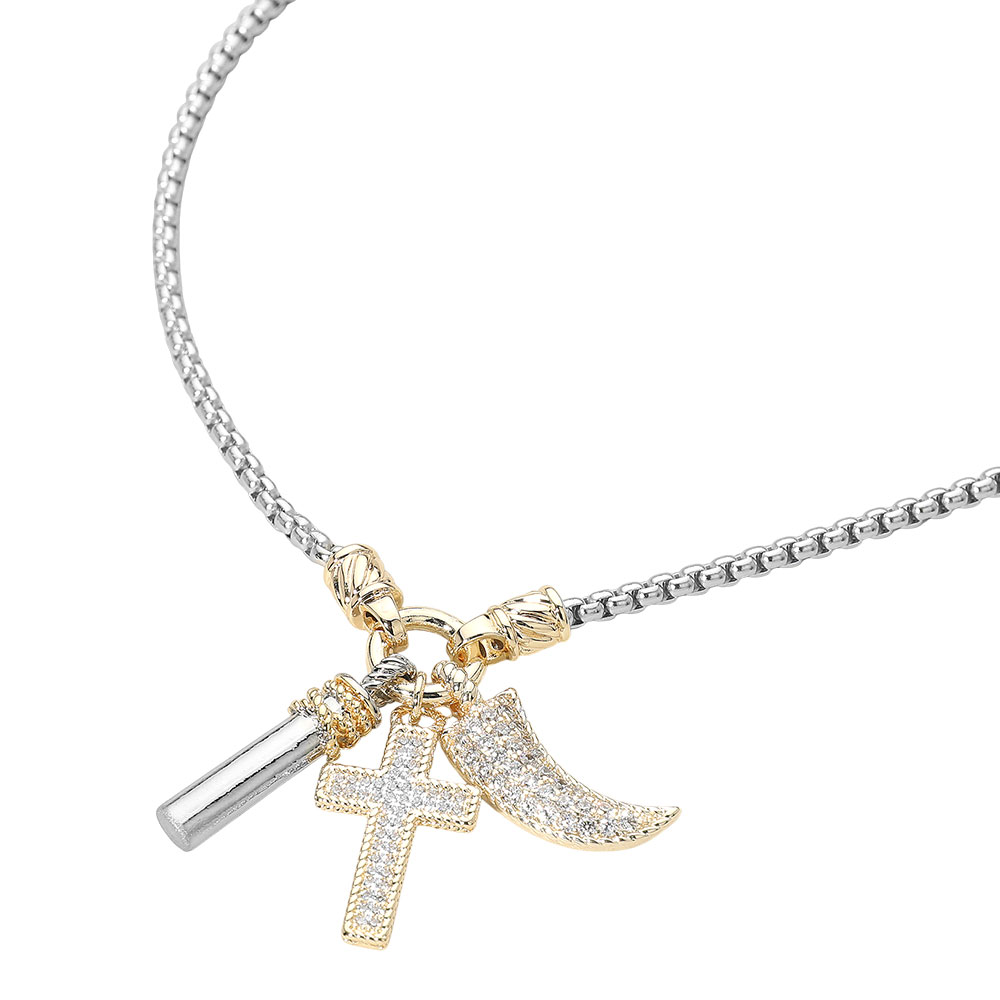 Details • Necklace Size : 17" + 2.5" L • Decor Size : 1.6" L • Discover a standout necklace featuring a trio of sparkling cubic zirconia charms including a cross and crescent, set on a sleek chain for modern elegance. Perfect for everyday styling or meaningful gifting with eye-catching brilliance and refined appeal. • CZ Cubic Zirconia • Gold Dipped
