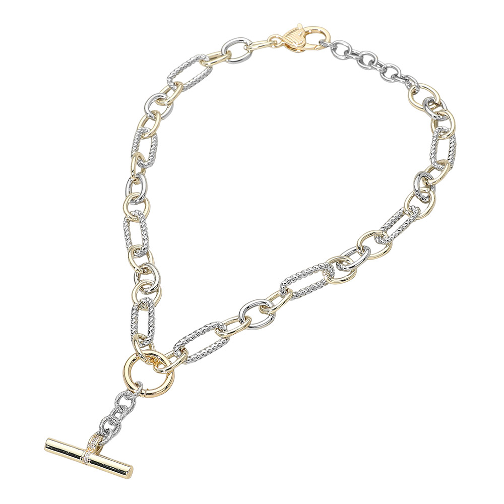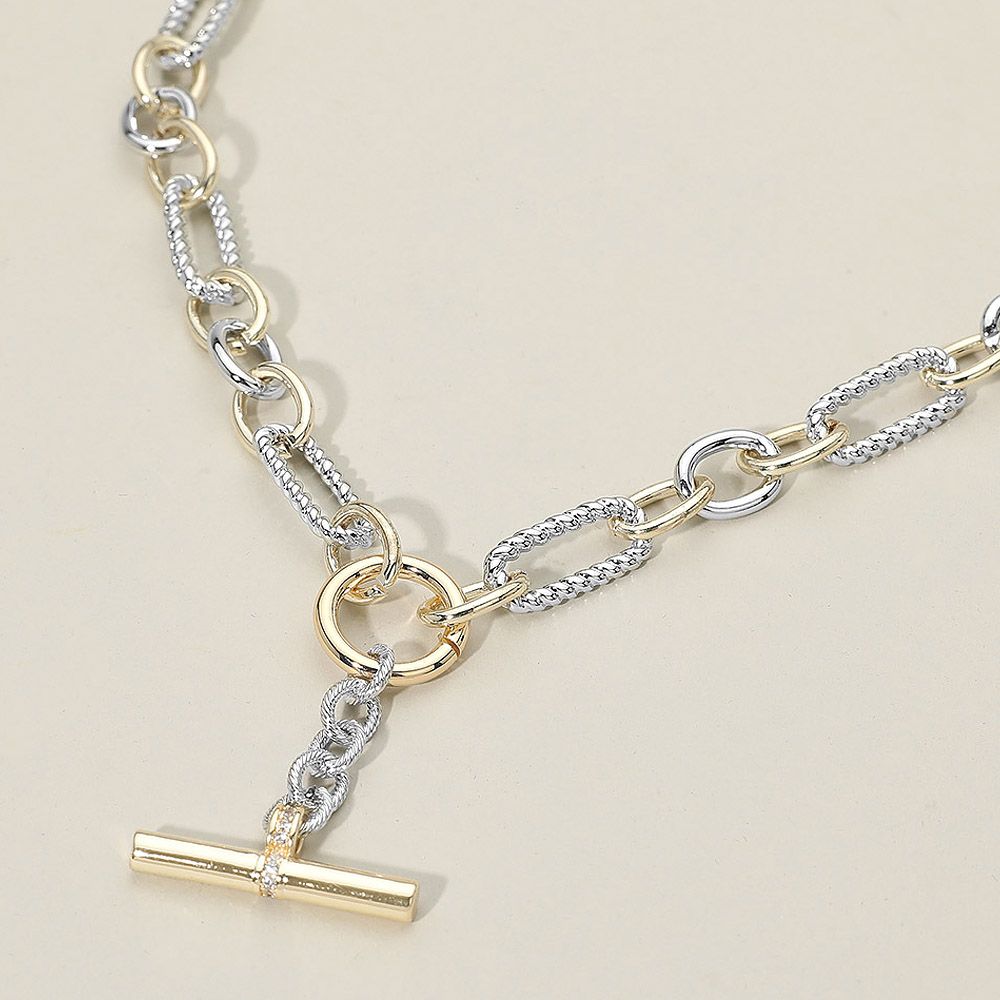 Details • Necklace Size : 16.5" + 2" L • Decor Size : 0.4" L • Pendant Size : 1" X 1.75" • Make a bold statement with this chain link necklace featuring mixed textures and a sparkling toggle clasp pendant. Its modern design pairs effortlessly with casual and dressy outfits, offering a chic layered look or standalone elegance. A versatile accessory to elevate your jewelry collection. • CZ Cubic Zirconia • Gold Dipped