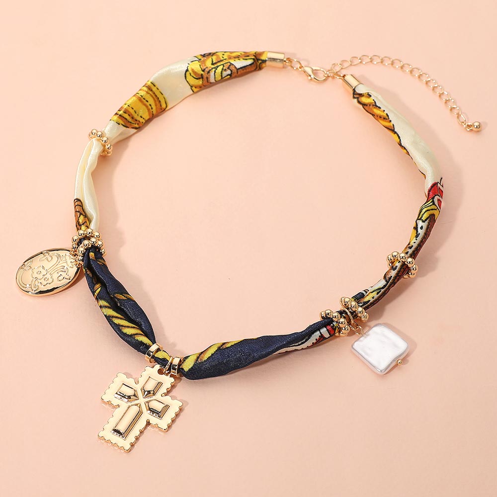 Boho Metal Cross Square Pearl Floral Oval Charm Fabric Necklace