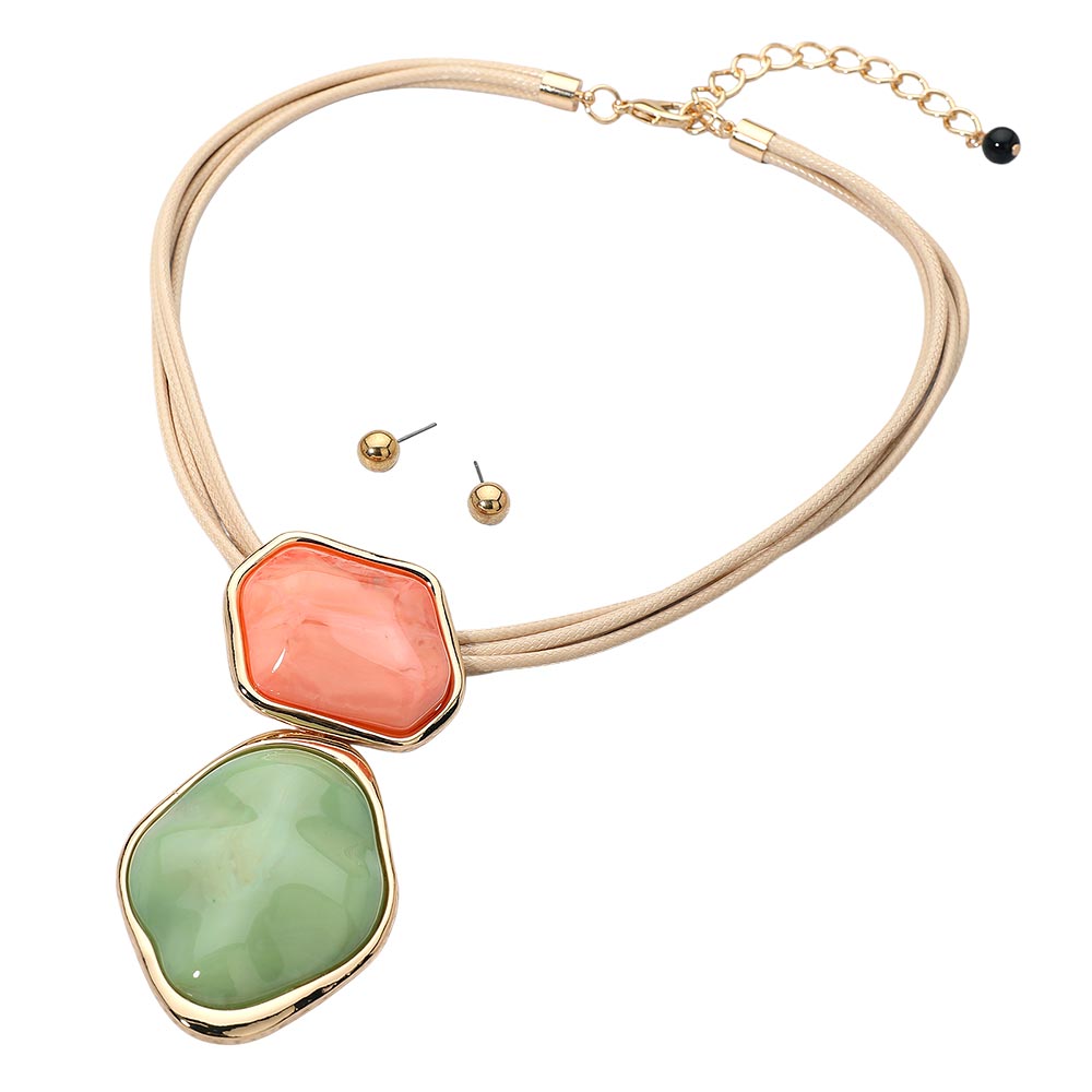 • Bold pendant necklace paired with coordinating stud earrings for a complete look. The unique layered design adds eye-catching detail, making this set perfect for elevating casual outfits or complementing evening attire with effortless elegance.