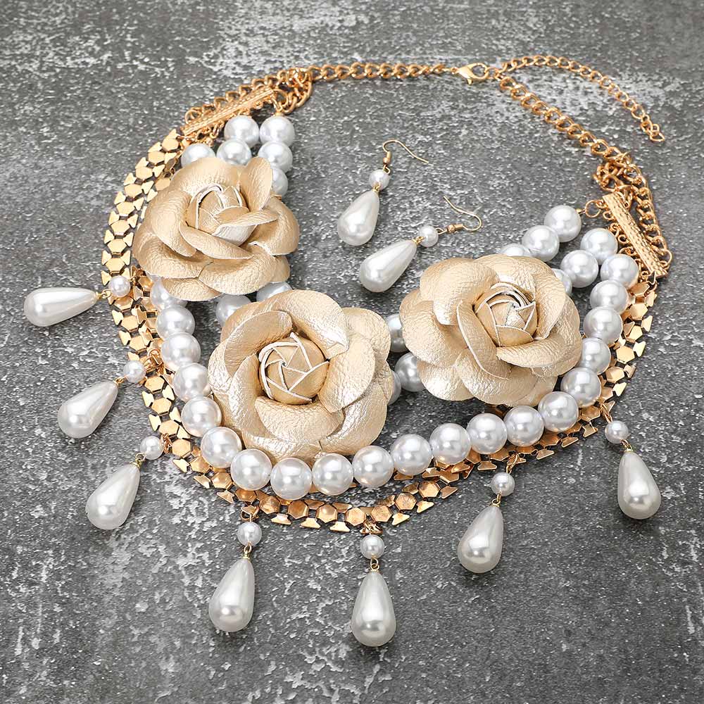 Details • Necklace Size : 20.5" + 4" L • Decor Size : 5.5" L • Earrings Size : 2.3" L • A striking statement set featuring layered beads, sculpted floral accents, and elegant drop details. Its dramatic silhouette enhances any special-occasion look, offering a refined and artistic accessory with timeless appeal. • Lead and Nickel Compliant