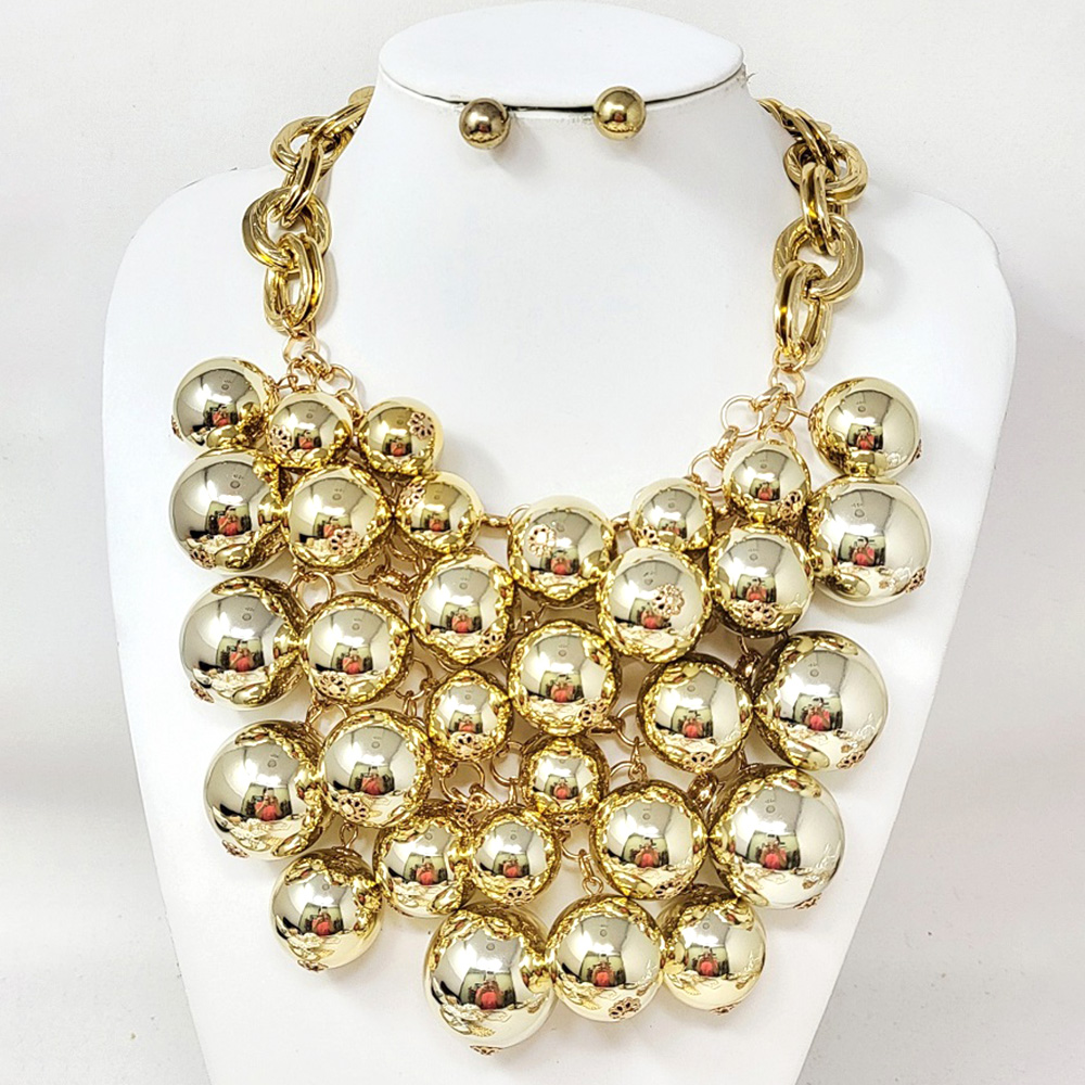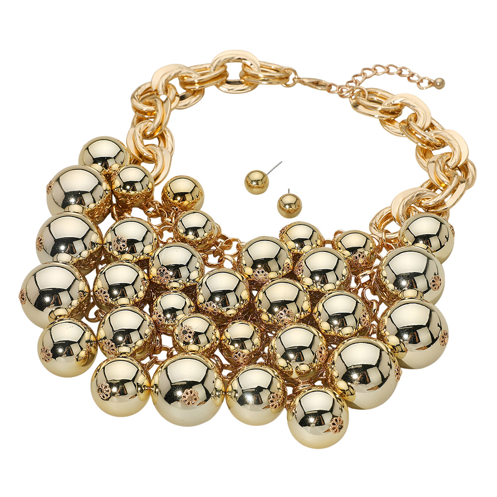 Details • Necklace Size : 18.5" + 3.25" L • Decor Size : 4" L • Earrings Size : 0.4" L • Make a striking impression with this bold statement necklace designed with oversized reflective beads and chunky chain links. Perfect for glamorous evenings or standout fashion looks, this dramatic piece brings shine, sophistication, and modern edge to any outfit. • Lead and Nickel Compliant