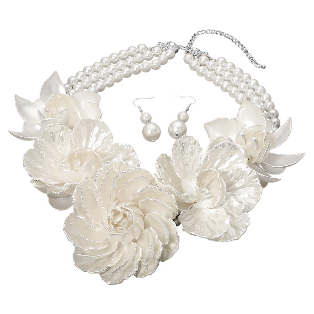 Bold Pearly Petal Floral Link Triple Pearl Strand Statement Necklace
