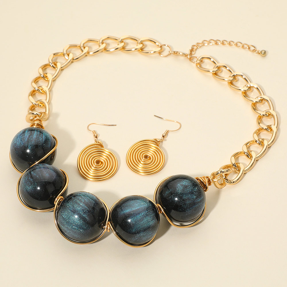 Details • Necklace Size : 22" + 3" L • Decor Size : 1.25" L • Earrings Size : 2.25" L • Make a statement with this striking necklace and matching earrings set, featuring oversized glossy spheres and spiral drop earrings. Designed with a chunky chain and artistic wire detailing, this set adds a modern and bold touch to elevate any fashion-forward look. • Lead and Nickel Compliant