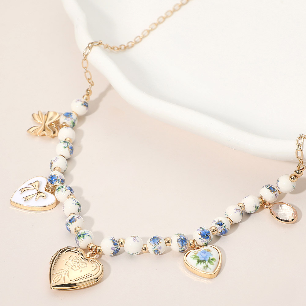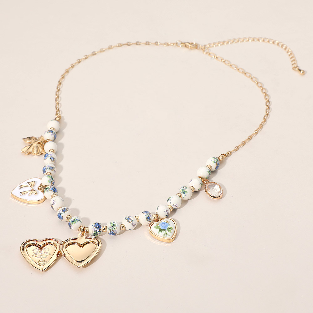 Details • Necklace Size : 16" + 3.5" L • Decor Size : 1" L • This beaded heart charm necklace blends vintage-inspired detailing with modern elegance. Featuring a mix of intricate charms and smooth beads, it brings a romantic and artistic touch to any outfit, making it a timeless accessory for both casual and dressy occasions. • Lead and Nickel Compliant