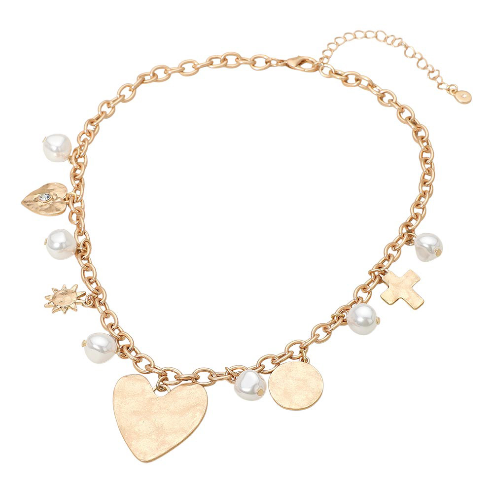 Brushed Metal Heart Cross Pearl Charm Station Chunky Necklace