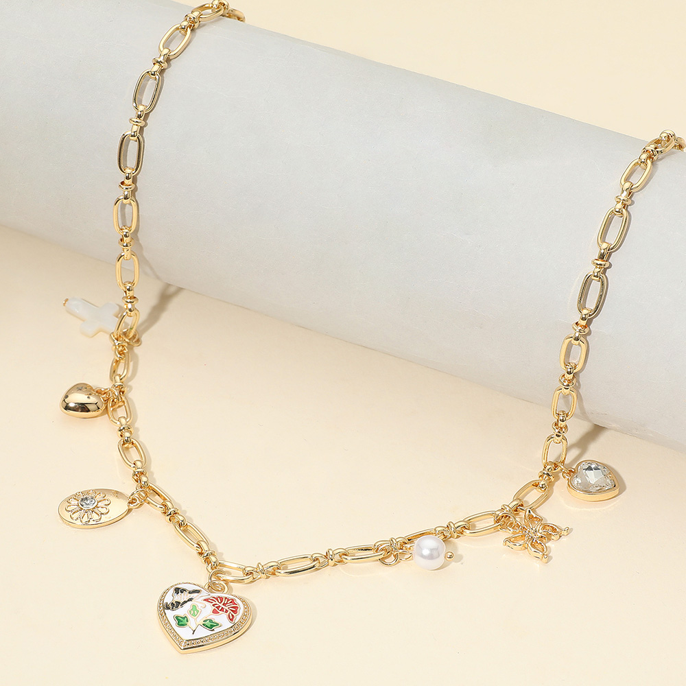 • Elevate your accessories with this charm necklace featuring a mix of symbolic pendants including hearts, floral details, a cross, and pearl accents. Designed on a bold chain, this statement piece adds personality, elegance, and versatility to both casual and dressy outfits.