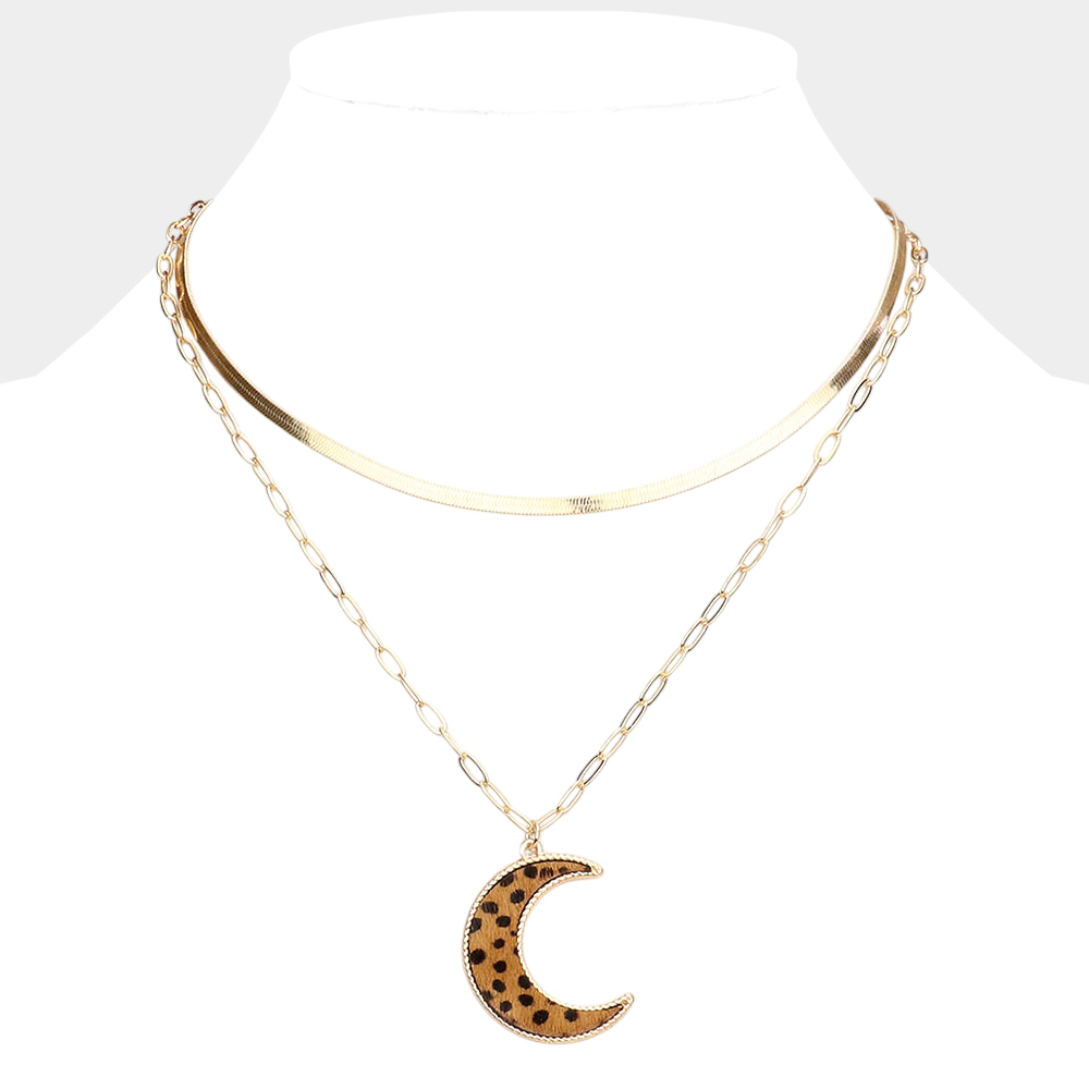 Leopard Patterned Genuine Leather Crescent Moon Pendant Double Layered Necklace