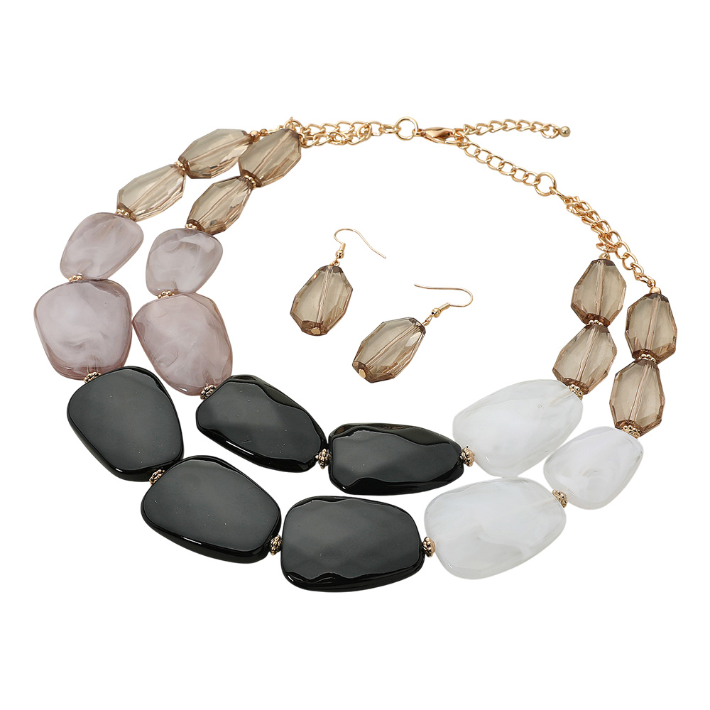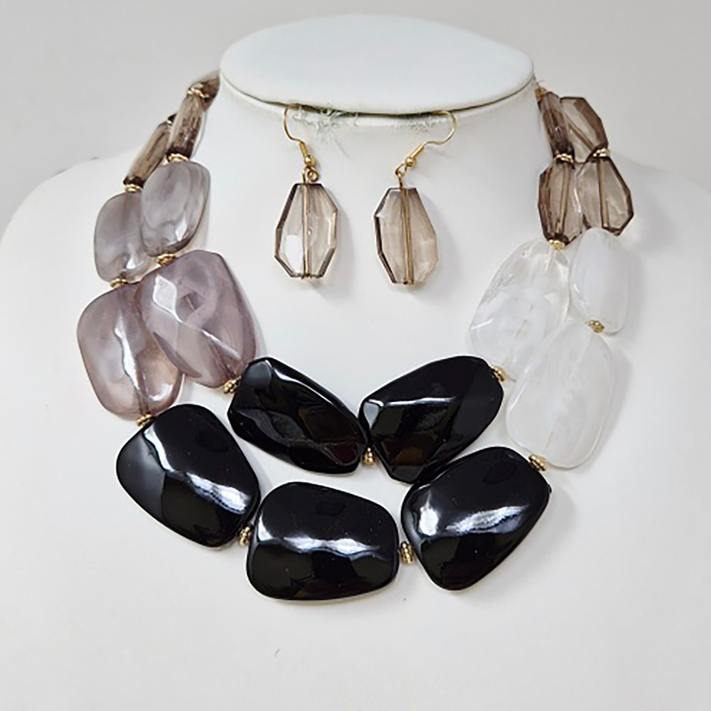 • Elevate your look with this chunky beaded statement necklace set featuring bold beads in neutral tones of black, white, and smoky brown. Complete with matching drop earrings, this versatile set adds sophistication to both formal attire and chic everyday outfits.