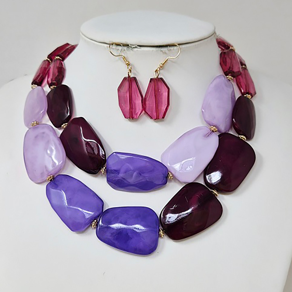 Details • Necklace Size : 17.5" + 3" L • Decor Size : 2" L • Earrings Size : 2" L • Elevate your look with this chunky beaded statement necklace set featuring bold beads in neutral tones of black, white, and smoky brown. Complete with matching drop earrings, this versatile set adds sophistication to both formal attire and chic everyday outfits. • Lead and Nickel Compliant