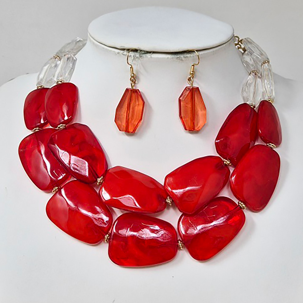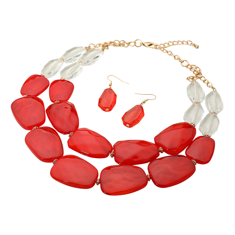 Details • Necklace Size : 17.5" + 3" L • Decor Size : 2" L • Earrings Size : 2" L • Elevate your look with this chunky beaded statement necklace set featuring bold beads in neutral tones of black, white, and smoky brown. Complete with matching drop earrings, this versatile set adds sophistication to both formal attire and chic everyday outfits. • Lead and Nickel Compliant