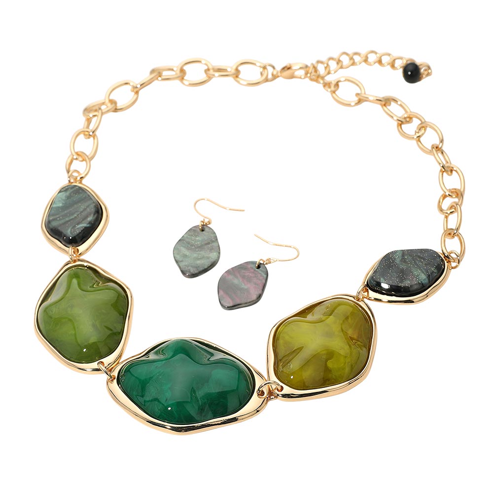 • This chunky gem statement necklace and earring set features an artistic organic design with sculpted, polished stones framed in elegant settings. Perfect for bold, confident style, it adds warmth and sophistication to any outfit, ideal for special occasions or evening wear.
