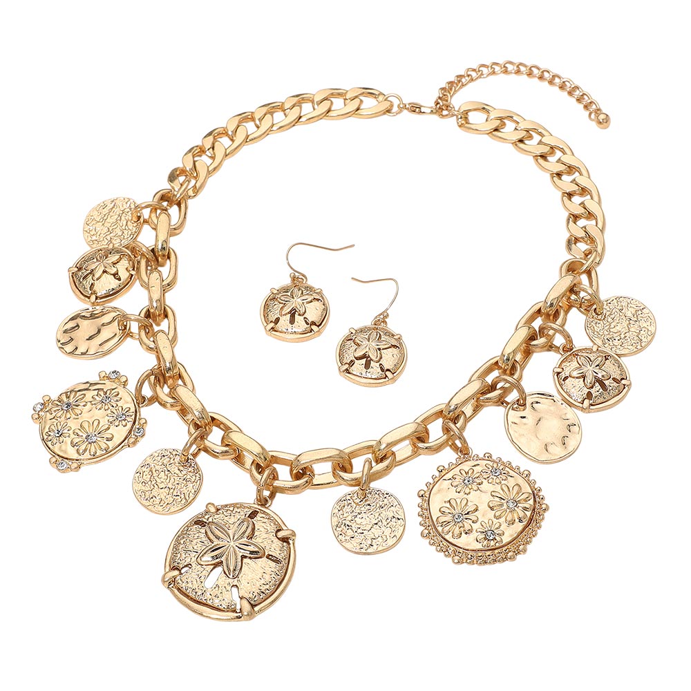 Details • Necklace Size : 17" + 3" L • Decor Size : 2" L • Earrings Size : 1.25" L • Statement necklace and earring set featuring a bold chain adorned with engraved medallion charms for an artistic, textured look. Perfect for elevating casual or dressy outfits, this coordinated set offers unique detailing and versatile style, making it ideal for gifting or adding flair to your collection. • Lead and Nickel Compliant