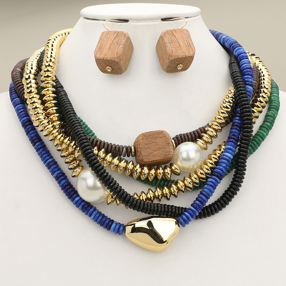 Chunky Pearl Wooden Cube Metal Pebble Accent Multi Disc Beaded Layered Toggle Statement Necklace