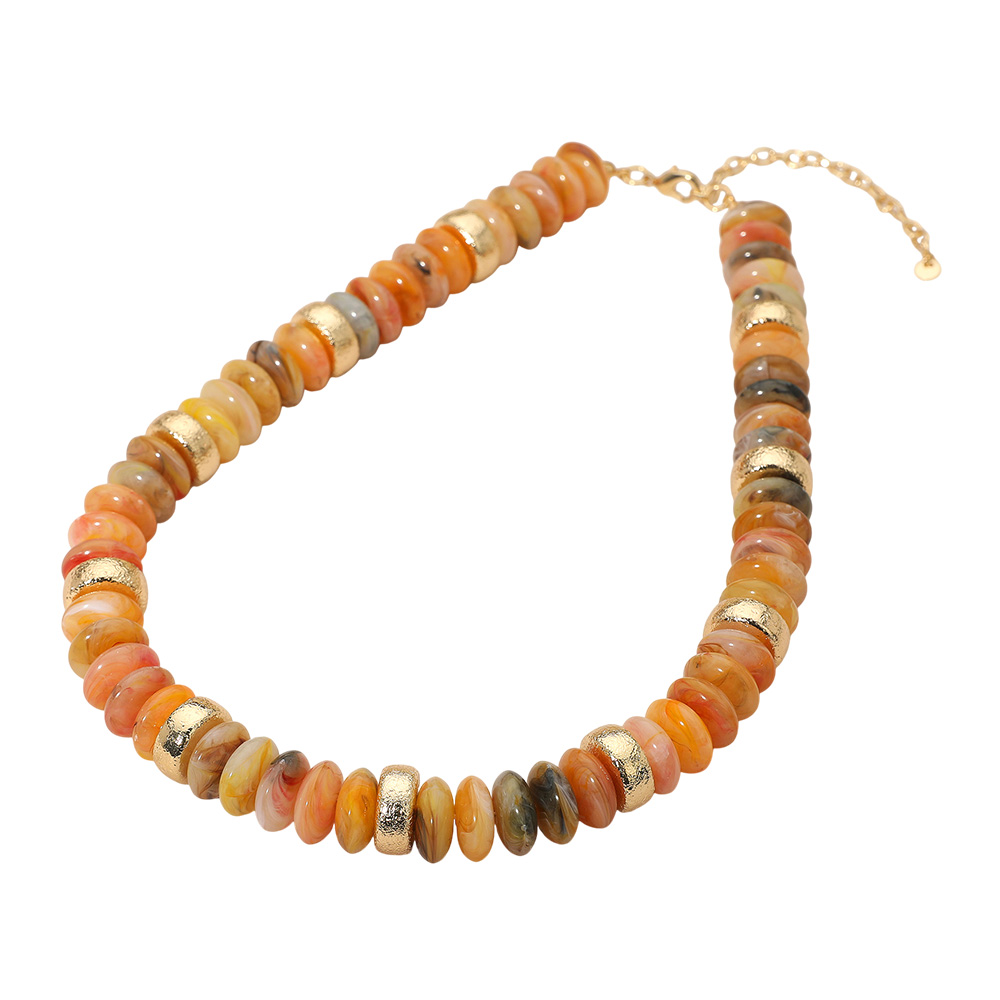 Details • Necklace Size : 17" + 3" L • Decor Size : 0.6" L • Bold and contemporary, this chunky beaded necklace features smooth disc-shaped beads with metallic gold-tone spacers. A versatile statement piece that elevates any outfit with its sleek, modern design. • Lead and Nickel Compliant