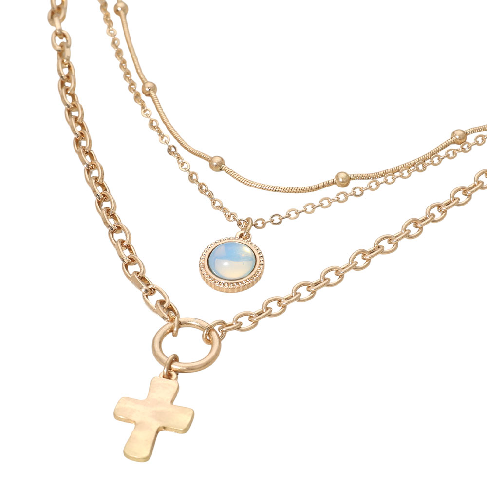 Details • Necklace Size : 14.5" + 3.5" L • Decor Size : 3.4" L • Enhance everyday style with this layered cross charm necklace, featuring multiple delicate chains paired with a classic cross accent and a glowing round detail for added depth. Ideal for effortless layering or wearing solo to create a polished, on-trend look suited to casual or dressy outfits. • Lead and Nickel Compliant