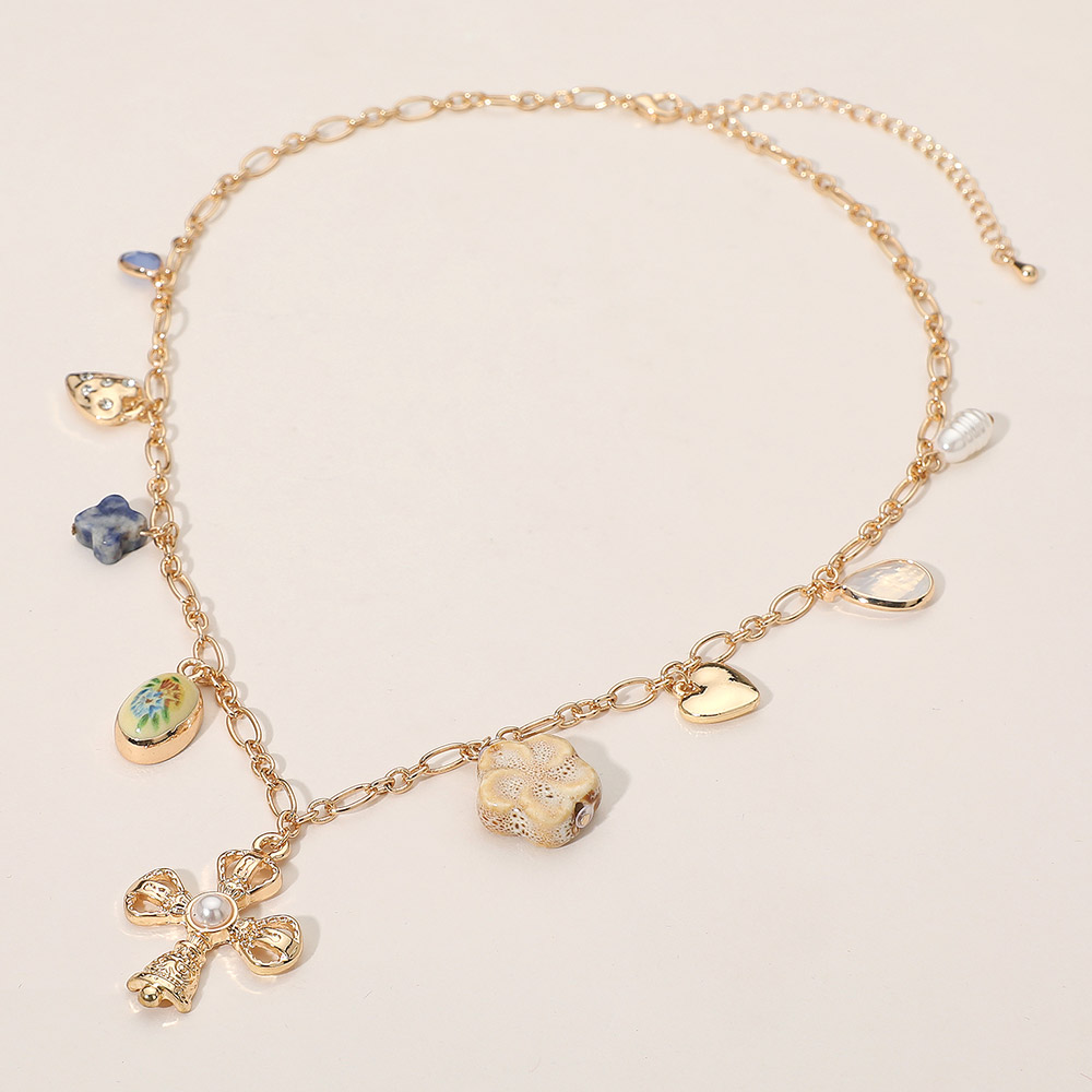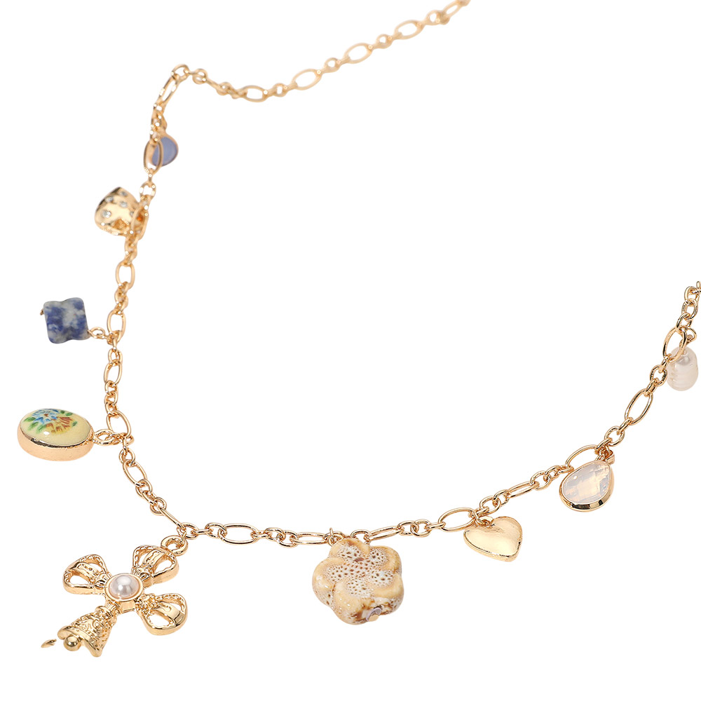 Details • Necklace Size : 16" + 3.5" L • Decor Size : 1.24" L • This mixed charm chain necklace showcases a stunning collection of pendants, including hearts, a bow, and floral motifs. With its balanced blend of elegance and playful charm, it adds a touch of sophistication and individuality to any look, perfect for layering or everyday wear. • Lead and Nickel Compliant