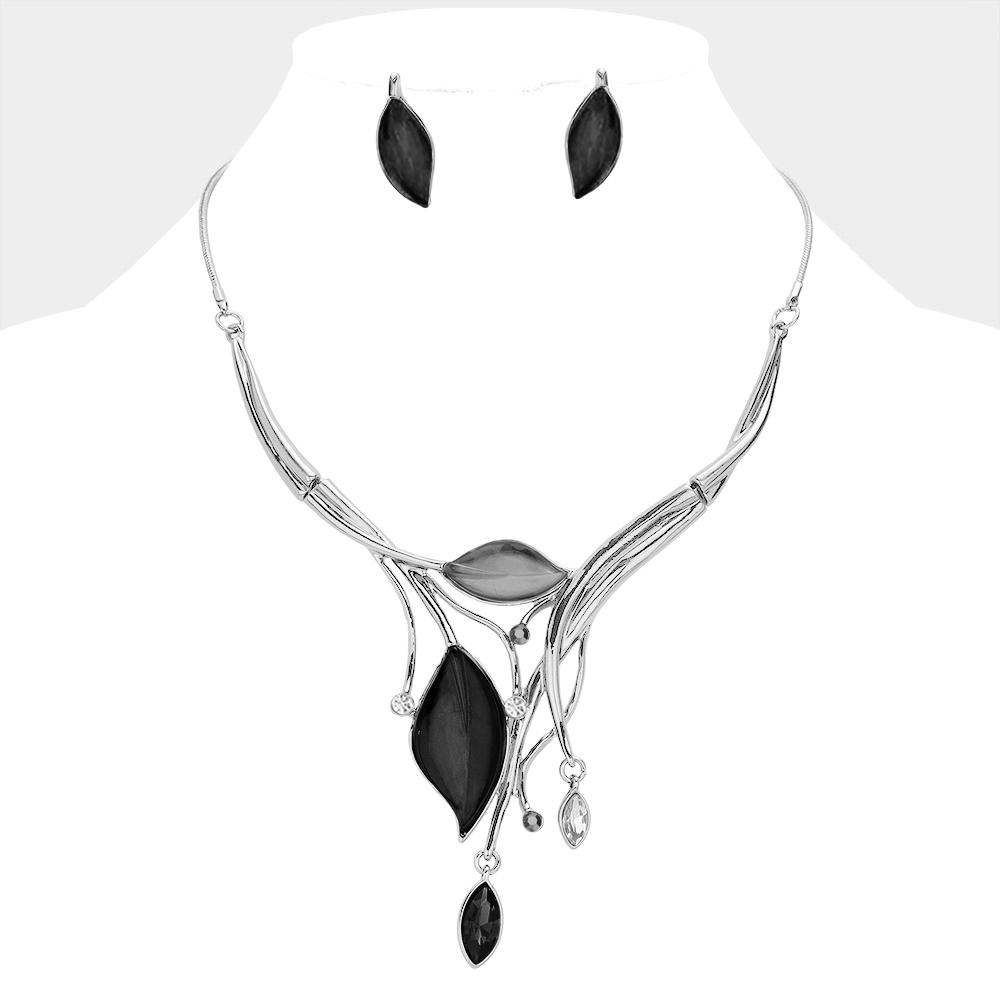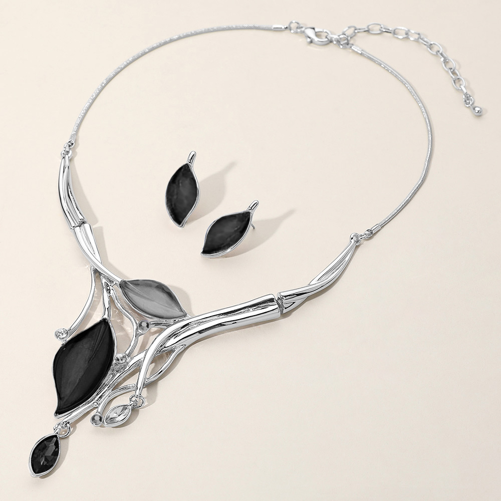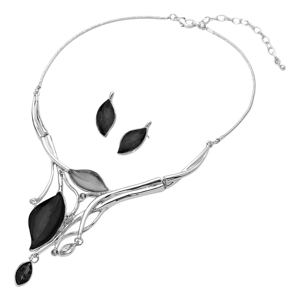 • Elegant leaf pendant necklace with matching earrings featuring sleek metallic accents and delicate leaf shapes. This jewelry set adds a refined and feminine touch, perfect for formal occasions or stylish everyday wear.