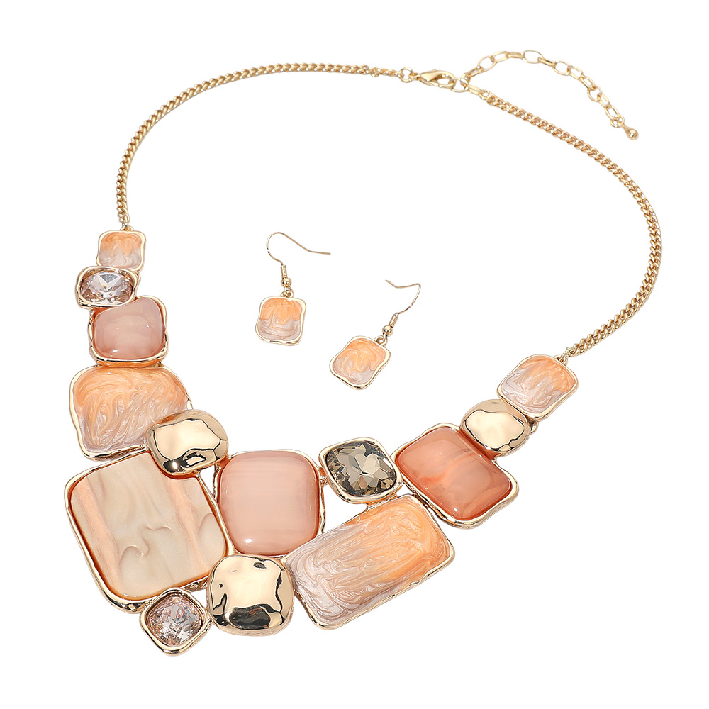 Details • Necklace Size : 18" + 3.5" L • Decor Size : 2.5" L • Earrings Size : 1.4" L • Modern statement necklace and earrings set featuring a mosaic of enamel geometric plate accents framed in metallic trim. The bold mix of smooth and marbled textures adds artistic flair, making it a standout accessory for elegant or contemporary fashion ensembles. • Lead and Nickel Compliant
