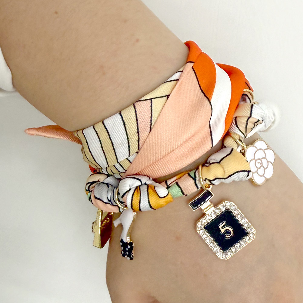 Details • Size : 26.5" L • Charm Size : 1.5" L • Print may vary • A chic scarf accessory designed to be worn as a necklace, bracelet, or bag charm. Featuring a printed scarf with stylish fashion-inspired charms, it adds a versatile and modern touch to your look. Available in 2 unique designs for standout style. • Brass • Gold Dipped • Hypoallergenic • Lead and Nickel Compliant • Made In Korea
